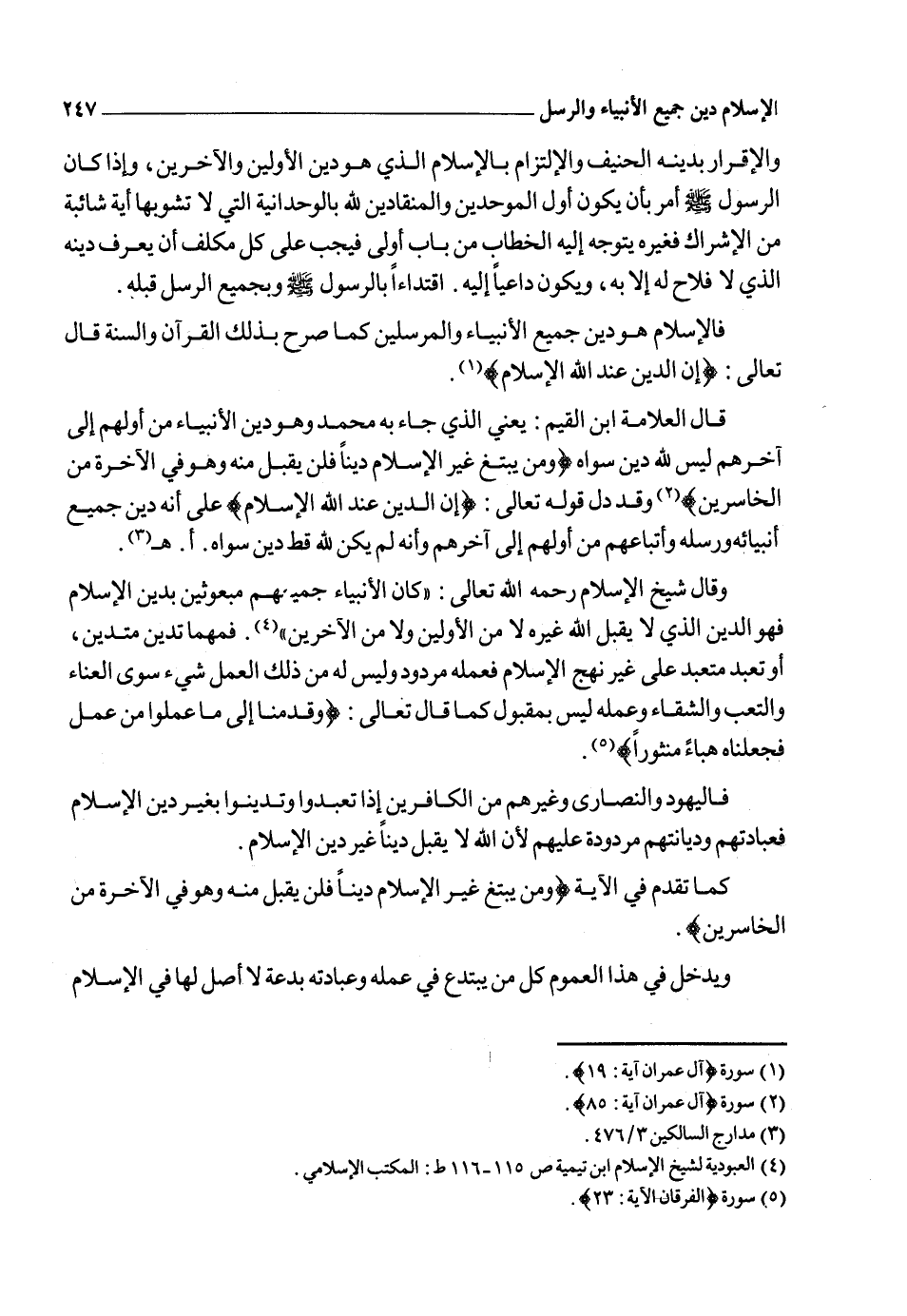 وقد بين الله ـ تعالى ـ أن جميع الأنبياء دعوا أممهم إلى الإسلام فقد قال نوح عليه الصلاة والسلام فيما حكاه الله عنه: {فَإِنْ تَوَلَّيْتُمْ فَمَا سَأَلْتُكُمْ مِنْ أَجْرٍ إِنْ أَجْرِيَ إِلاَّ عَلَى اللهِ وَأُمِرْتُ أَنْ أَكُونَ مِنَ الْمُسْلِمِينَ} 2.