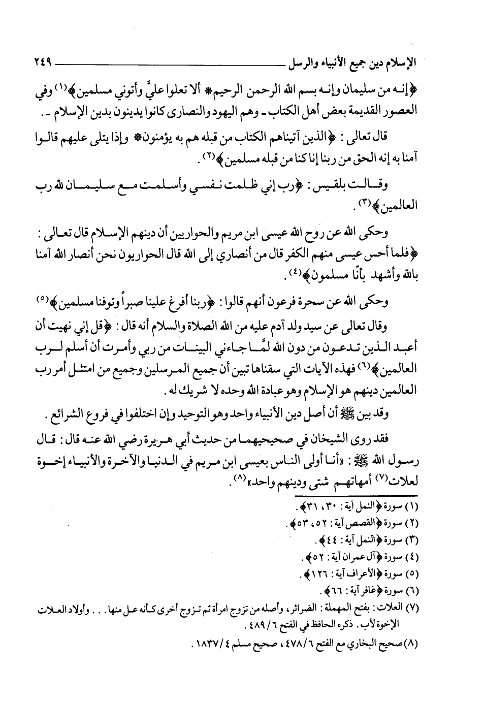 ومما تقدم يتبين أن الإسلام دين الأولين والآخرين من بني آدم، وأن أول المسلمين في جميع الشرائع الإلهية هم الرسل، لأن الرسل هم أول من يعرف الشرائع، والكتب المنزلة عليهم من عند الله تعالى. فالخير كل الخير بالأخذ بالإسلام الذي رضيه الله ديناً لعباده المؤمنين.