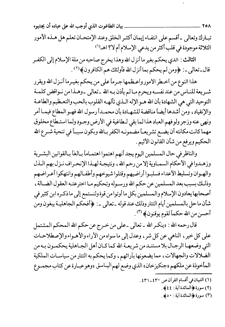من أحكام قد اقتبسها من شرائع شتى من اليهودية والنصرانية، والملة الإسلامية، وفيها كثير من الأحكام أخذها من مجرد نظره وهواه فصارت في بنيه شرعاً متبعاً يقدمونها على الحكم بكتاب الله وسنة رسوله صلى الله عليه وسلم فلا يحكم سواه في قليل ولا كثير"1.