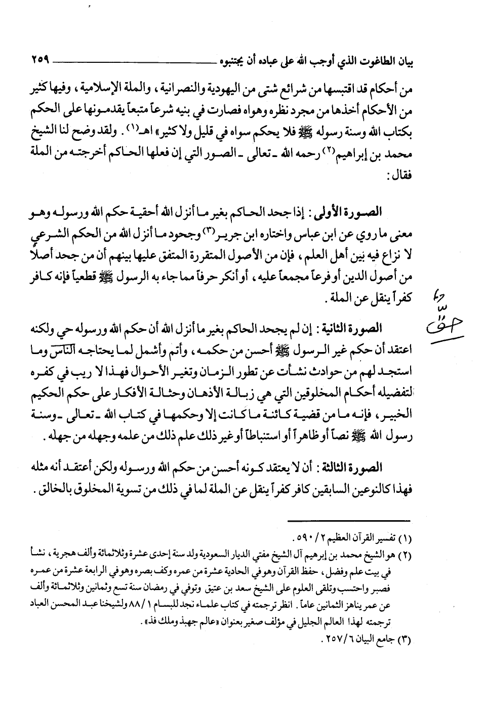 ولخطورة هذا النوع من رؤوس الطواغيت أسهبنا في الكلام حوله إذ الحكم بغير ما أنزل الله قد عم وطم الكثير من الكرة الأرضية إلا من رحم الله ـ تعالى ـ مثل بعض البلدان التي أراد الله لها الخير فتمسكت بكتاب ربها وسنة نبيها فحماه الله من الاضطرابات وعمها الخير والرخاء.