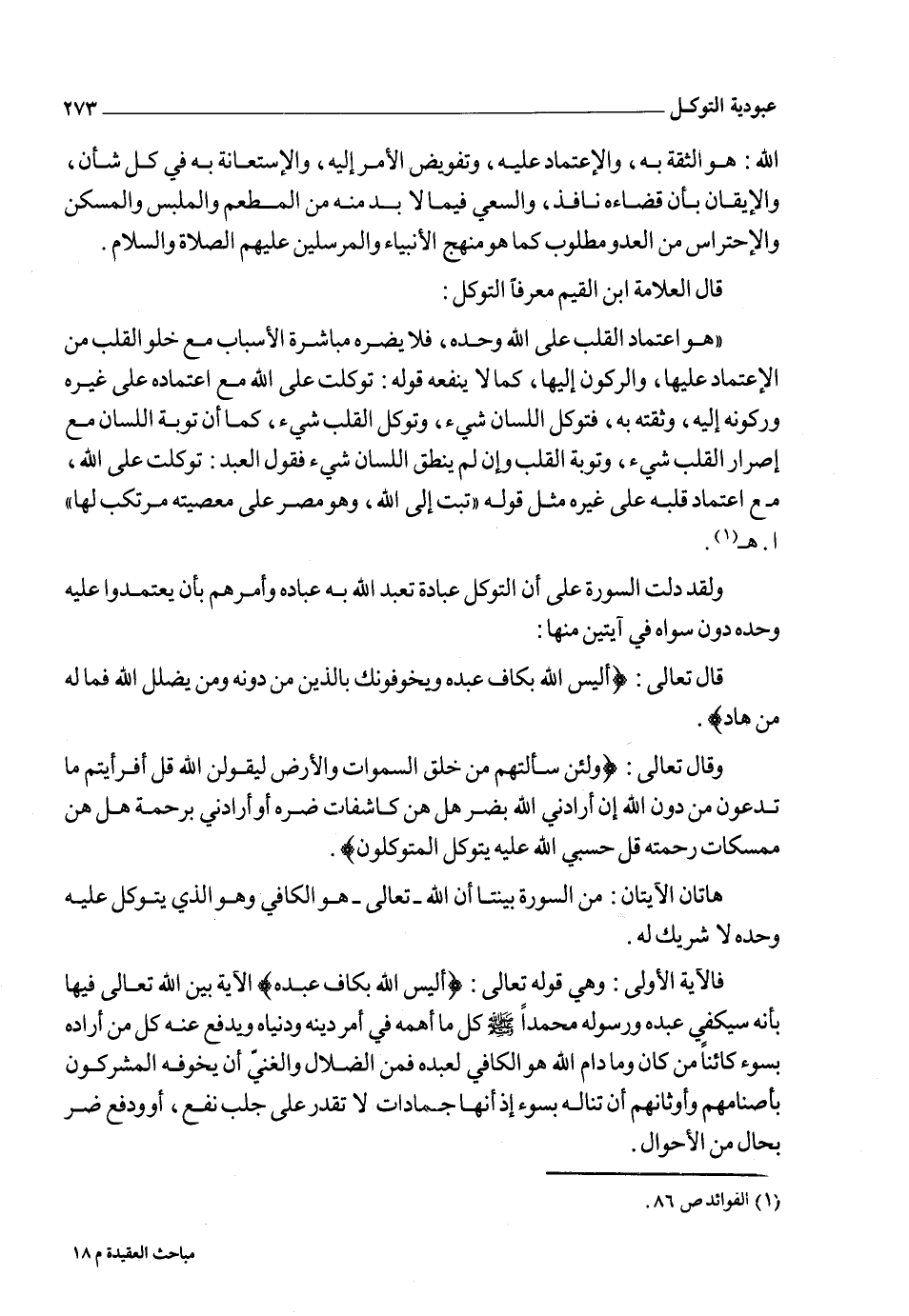 وأما قوله تعالى في الآية الثانية: {قُلْ حَسْبِيَ اللهُ عَلَيْهِ يَتَوَكَّلُ الْمُتَوَكِّلُونَ} أمر الله نبيه بأن يقول: للمشركين بعد أن تبين بالدليل القاطع على أنه وحده المعبود وأنه الخالق لجميع المخلوقات النافع الضار وحده وأن غيره عاجز من جميع الوجوه عن الخلق والنفع والضر مستجلباً كفايته ومستدفعاً مكر المشركين وكيدهم {قُلْ حَسْبِيَ اللهُ عَلَيْهِ يَتَوَكَّلُ الْمُتَوَكِّلُونَ} أي: عليه يعتمد المعتمدون في جلب المصالح ودفع المضار فالله هو الذي بيده وحده الكفاية هو حسبي سيكفيني كل ما أهمني وما لا أهتم به.