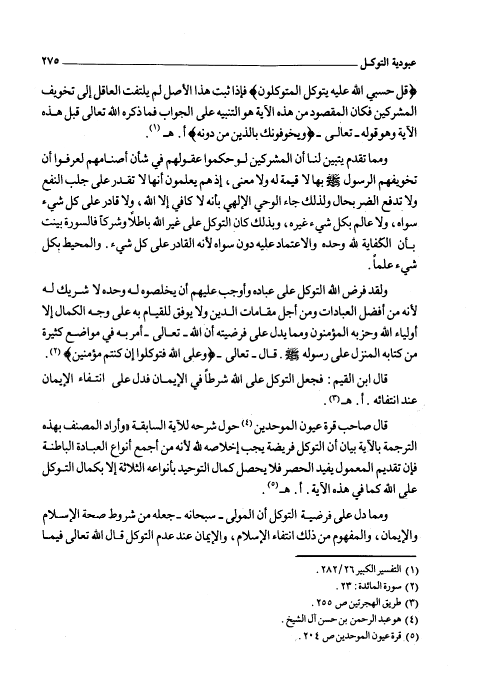 وقال تعالى: {وَعَلَى اللهِ فَتَوَكَّلُوا إِنْ كُنْتُمْ مُؤْمِنِينَ} 2. فهاتان الآيتان دلتا على أن صحة الإسلام والإيمان متوقفة على صحة التوكل.