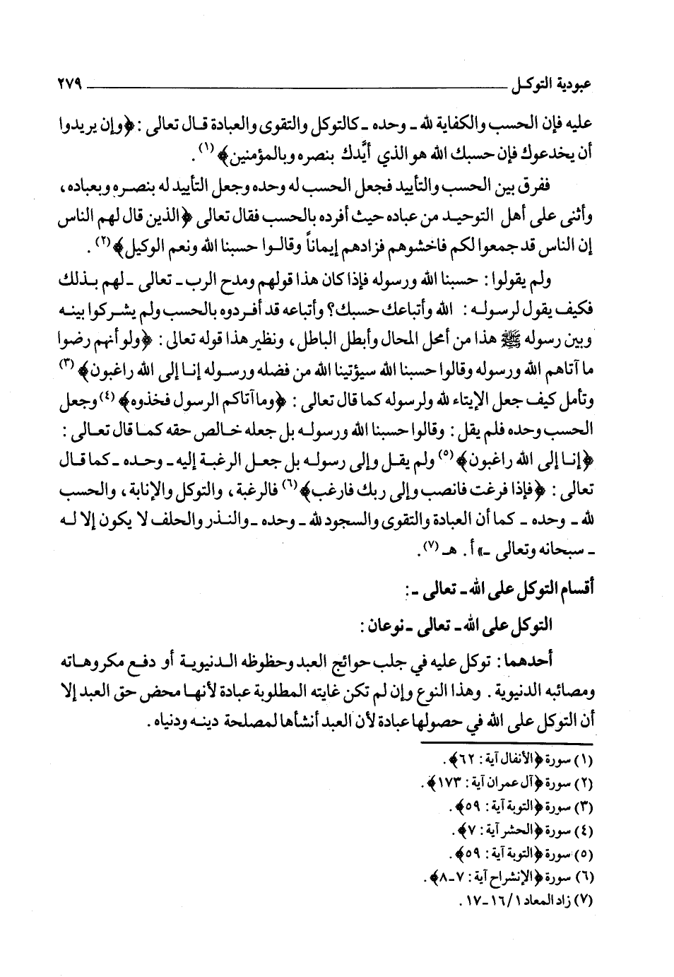 الثاني: "التوكل عليه في حصول ما يحبه هو ويرضاه من الإيمان واليقين والجهاد والدعوة إليه. فغاية هذا النوع عبادة، وهو في نفيه عبادة فإن العبد استعان بالله على ما يرضيه فصاحبه متحقق بإياك نعبد وإياك نستعين فمن تركه فقد ترك شطر دينه، وبين هذين النوعين من الفضل ما لا يحصيه إلا الله ـ تعالى ـ فمتى توكل عليه العبد في النوع الثاني حق توكله كفاه النوع الأول تمام الكفاية. ومتى توكل عليه من النوع الأول دون الثاني كفاه أيضاً، لكن لا يكون له عاقبة المتوكل فيما يحبه ويرضاه، فأعظم التوكل عليه التوكل في الهداية وتجريد التوحيد ومتابعة الرسول وجهاد أهل الباطل، فهذا توكل الرسل وخاصة أتباعهم"1.