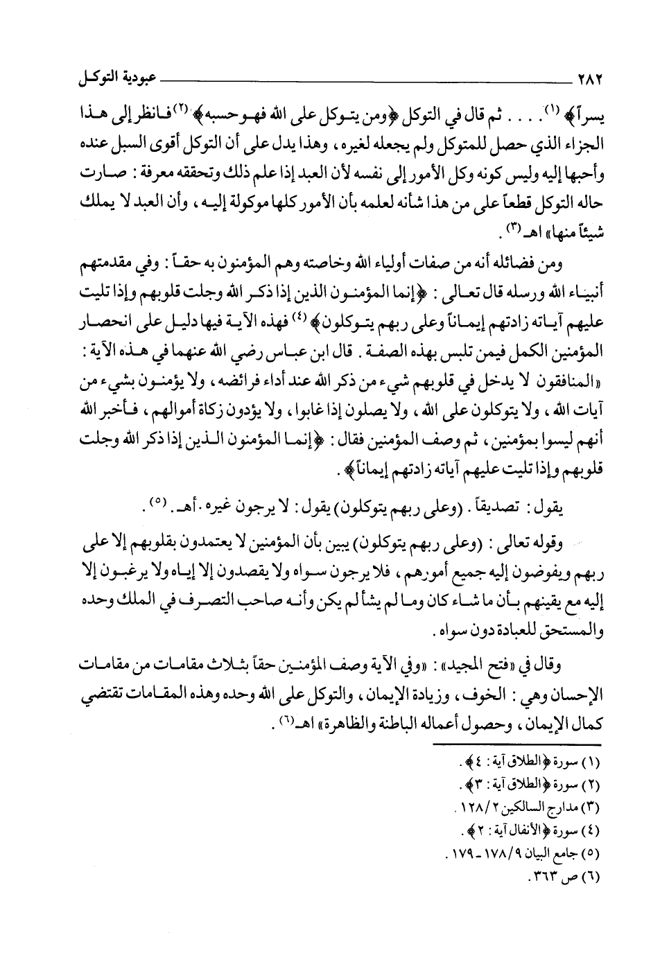 {وَمَا لَنَا أَلاَّ نَتَوَكَّلَ عَلَى اللهِ وَقَدْ هَدَانَا سُبُلَنَا} 1 دلت هذه الآية على أن الجمع بين التوكل والهداية من تحقق الإيمان، ومصيبة الإنسان إما من عدم الهداية وإما من عدم توكله على الله، كما دلت أيضاً على أن الرسل عليهم الصلاة والسلام كان حالهم التوكل على الله وحده، والقرآن مملؤ بذكر التوكل إما أمراً به، وإما إخباراً عن خاصة الله وأوليائه وهم المؤمنون بأنهم حققوا عبودية التوكل، وقد أمر الله نبيه وخاتم رسله بالتوكل عليه في مواضع كثيرة من كتابه وسماه المتوكل كما روى ذلك البخاري من حديث عبد الله بن عمرو رضي الله عنهما أن هذه الآية التي في القرآن {يَا أَيُّهَا النَّبِيُّ إِنَّا أَرْسَلْنَاكَ شَاهِداً وَمُبَشِّراً وَنَذِيراً} 2 قال في التوراة: "يا أيها النبي إنا أرسلناك شاهداً ومبشراً وحرزاً للأميين أنت عبدي ورسولي سميتك المتوكل ليس بفظ ولا غليظ3 ولا سخاب4 بالأسواق ... " الحديث5.