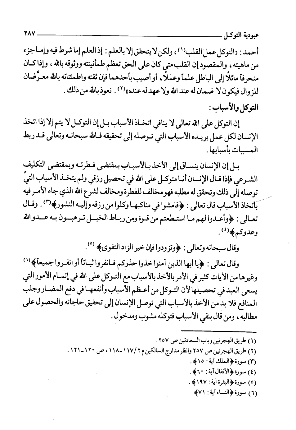 وقد اقتضت حكمة أحكم الحاكمين ربط المسببات بأسبابها، فلا يجوز للإنسان تعطيلها مهما أمكنه القيام بها، فإذا فعلها عبودية يكون قد أتى بعبودية القلب بالتوكل وعبودية الجوارح بالسبب المنوي به القربة. وتحقيق التوكل موقوف على القيام بالأسباب المأمور بها، فمن عطلها لم يصح توكله، كما أن القيام بالأسباب المفضية إلى حصول الخير يحقق رجاءه فمن لم يقم بها كان رجاؤه تمنياً، كما أن من عطلها يكون توكله عجزاً، وعجزه توكلاً لله2 فالتارك للأسباب المطلوبة منه شرعاً وعقلاً ويقول: إن كان قضي لي وسبق في الأزل حصول الولد فإنه آت لا محالة ولو لم أتزوج فهذا لا شك أنه يكون موقع إنكار الناس بل ربما يقال فيه إنه ليس من جملة العقلاء وأن البهائم أفهم منه فإن الواقع المشاهد من حال الحيوان أنه يسعى في تحصيل رزقه بالهداية العامة التي منحها الله جميع خلقه.