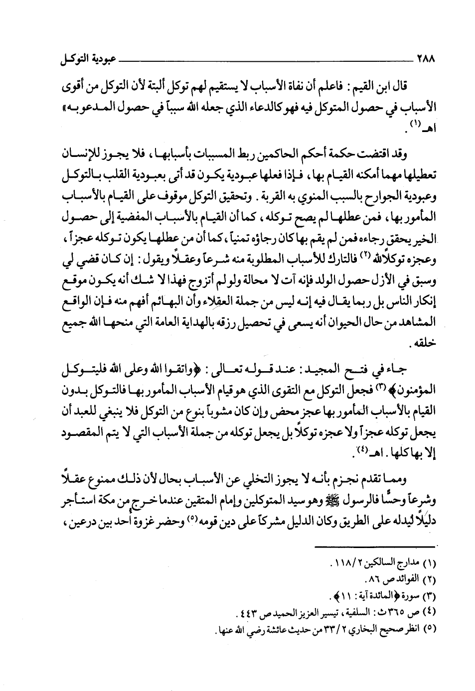 ولم يذكر أنه حضر الصف قط عرياناً1 وكفى به صلى الله عليه وسلم قدوةً في تحقيق عبودية التوكل وبيان كيفيته، وكان عليه الصلاة والسلام يدخر لأهله قوت سنة2 وكان إذا خرج مسافراً للجهاد أو للعمرة أو للحج حمل معه الزاد وكذلك الصحابة رضي الله عنهم، وهم أولو التوكل حقاً، ومن جاء بعد الصحابة ووفقه الله بأن وصل إلى القمة في التوكل إنما اشتم رائحة توكلهم من مسافة بعيدة، أو عثر على أثر من غبارهم، فحال النبي صلى الله عليه وسلم، وحال أصحابه هي الميزان الذي يقوم به حال من بعدهم، وعلى ضوء ذلك تعرف الأحوال الصحيحة من السقيمة، ولا يفوتنا أيضاً أن نقول: إن التوكل الذي كان في قلوب الصحابة كان سبباً في تبصير القلوب، وأن يعبد الله في جميع البلاد، وأن يوحده جميع العباد، فملئوا بتوكلهم القلوب هدى وإيماناً، وكانت هِمَمُهم عالية فكان أحدهم لا يصرف قوة توكله واعتماده على الله في أمر يحصل عليه بأقل حيلة وسعي، وإنما كانوا يتوكلون في الأمور العظيمة مثل فتح البلدان، والنصر على الأعداء، وتوطيد عقيدة التوحيد في كل مكان فرضي الله عنهم وأرضاهم3، وعلى ضوء هذا نقول: إن من يطعن في متخذي الأسباب مع التوكل فإنما يطعن بالدرجة الأولى في نبي الهدى صلى الله عليه وسلم وصحابته من بعده، ومن طعن في أولئك فليتهم نفسه بأنه على غير ملة الإسلام.