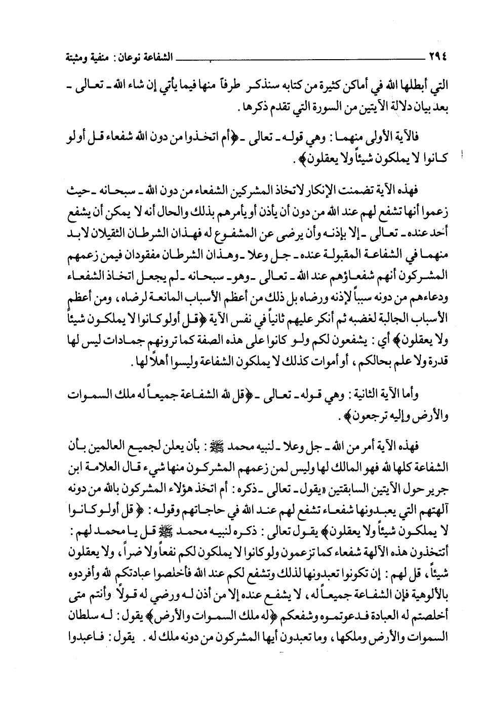 قال في تيسير العزيز الحميد: في هذه الآية رد على المشركين الذين اتخذوا الشفعاء من دون الله من الملائكة والأنبياء والأصنام المصورة على صور الصالحين وغيرهم وظنوا أنهم يشفعون عنده بغير إذنه فأنكر ذلك عليهم" أ. هـ5