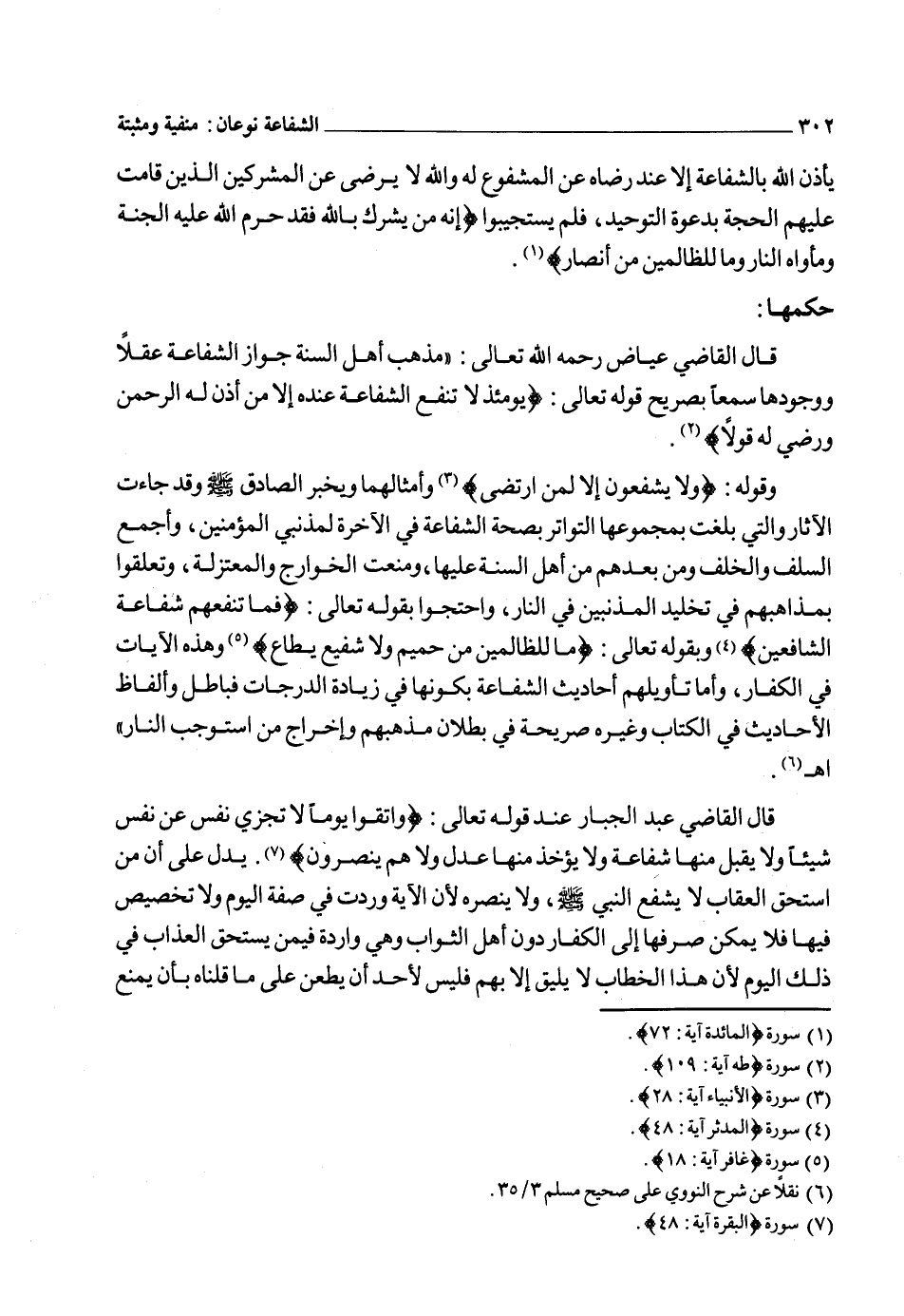 قال البيضاوي حول الآية السابقة التي استدل بها عبد الجبار بن أحمد على نفي الشفاعة "وقد تمسكت المعتزلة بهذه الآية على نفي الشفاعة لأهل الكبائر وأجيب بأنها مخصوصة بالكفار للآيات والأحاديث الواردة في الشفاعة، ويؤيده أن الخطاب معهم والآية نزلت رداً لما كانت اليهود تزعم أن آباءهم تشفع لهم" اهـ2.