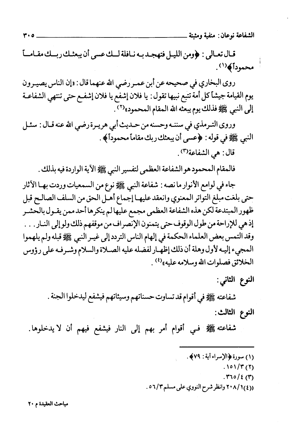 ومما يستدل به لهذين النوعين قوله صلى الله عليه وسلم: "يجمع الله تبارك وتعالى الناس فيقوم المؤمنون حتى تزلف لهم الجنة فيأتون آدم فيقولون: يا أبانا استفتح لنا الجنة فيقول: وهل أخرجكم من الجنة إلا خطيئة أبيكم آدم لست بصاحب ذلك. اذهبوا إلى ابني إبراهيم خليل الله قال فيقول: إبراهيم لست بصاحب ذلك إنما كنت خليلاً من وراء وراء اعمدوا موسى صلى الله عليه وسلم الذي كلمه الله تكليماً. فيأتون موسى صلى الله عليه وسلم فيقول: لست بصاحب ذلك اذهبوا إلى عيسى كلمة الله وروحه فيقول عيسى صلى الله عليه وسلم لست بصاحب ذلك فيأتون محمداً صلى الله عليه وسلم. فيقوم فيؤذن له. وترسل الأمانة والرحم فتقومان جنبتي الصراط يمناً وشمالاً فيمر أولكم كالبرق" قال قلت: بأبي أنت وأمي! أي شيء كمر البرق؟ قال: "ألم تروا إلى البرق كيف يمر ويرجع في طرفة عين؟ ثم كمر الريح ثم كمر الطير وشد الرحال تجري بهم أعمالهم ونبيكم قائم على الصراط يقول: رب! سلم سلم حتى تعجز أعمال العباد حتى يجيء الرجل فلا يستطيع السير إلا زحفاً" قال: "وفي حافتي الصراط كلاليب معلقة مأمورة بأخذ من أمرت به فمخدوش ناج ومكدوس1 في النار" 2.