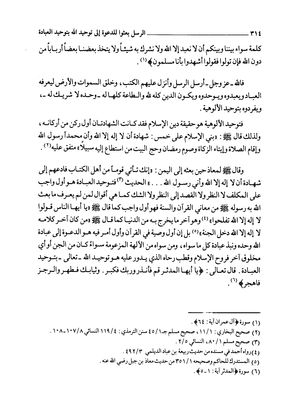 ومن هذه الآيات والأحاديث المتقدمة يتبين بطلان زعم بعض المتكلمين بأن غاية التوحيد هو: أن الله واحد في ذاته لا قسيم له وواحد في صفاته لا شبيه له، وواحد في أفعاله لا شريك له3 لأن التوحيد الذي أنزل الله به كتبه وأرسل به رسله ليس هو هذه الأمور الثلاث التي ذكروها، وإن كان فيها ما هو داخل في التوحيد الذي جاء به الرسول صلى الله عليه وسلم، ليس توحيدهم التوحيد الذي ذكر الله ورسوله، وهو عبادة الله وحده، فمن عبد الله، لم يشرك به شيئاً فقد وحده، ومن عبد دونه شيئاً من الأشياء فهو مشرك ليس بموحد مخلص له الدين، وإن كان مع ذلك قائلاً بهذه المقالات التي زعموا أنها التوحيد حتى لو أقر بأن الله وحده خالق كل شيء وهو "التوحيد في الأفعال" لكان مشركاً، وهذه حال مشركي العرب الذي بعث الرسول إليهم ابتداء وأنزل القرآن ببيان شركهم ودعاهم إلى توحيد الله وإخلاص الدين له"4.