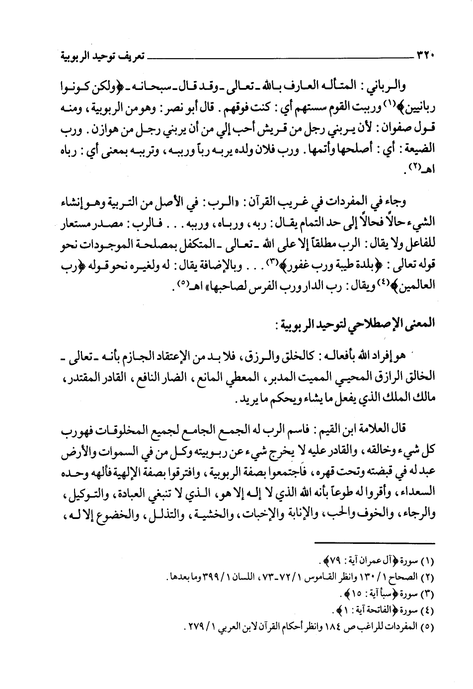 وقال في تيسير العزيز الحميد معرفاً توحيد الربوبية: "هو الإقرار بأن الله ـ تعالى ـ رب كل شيء ومالكه، وخالقه ورازقه، وأنه المحيي المميت النافع الضار المتفرد بإجابة الدعاء عند الاضطرار، الذي له الأمر كله، وبيده الخير كله القادر على ما يشاء، ليس له في ذلك شريك، ويدخل في ذلك الإيمان بالقدر وهذا التوحيد لا يكفي العبد في حصول الإسلام بل لا بد أن يأتي مع ذلك بلازمه من توحيد الإلهية، لأن الله حكى عن المشركين أنهم مقرون بهذا التوحيد له وحده"2.