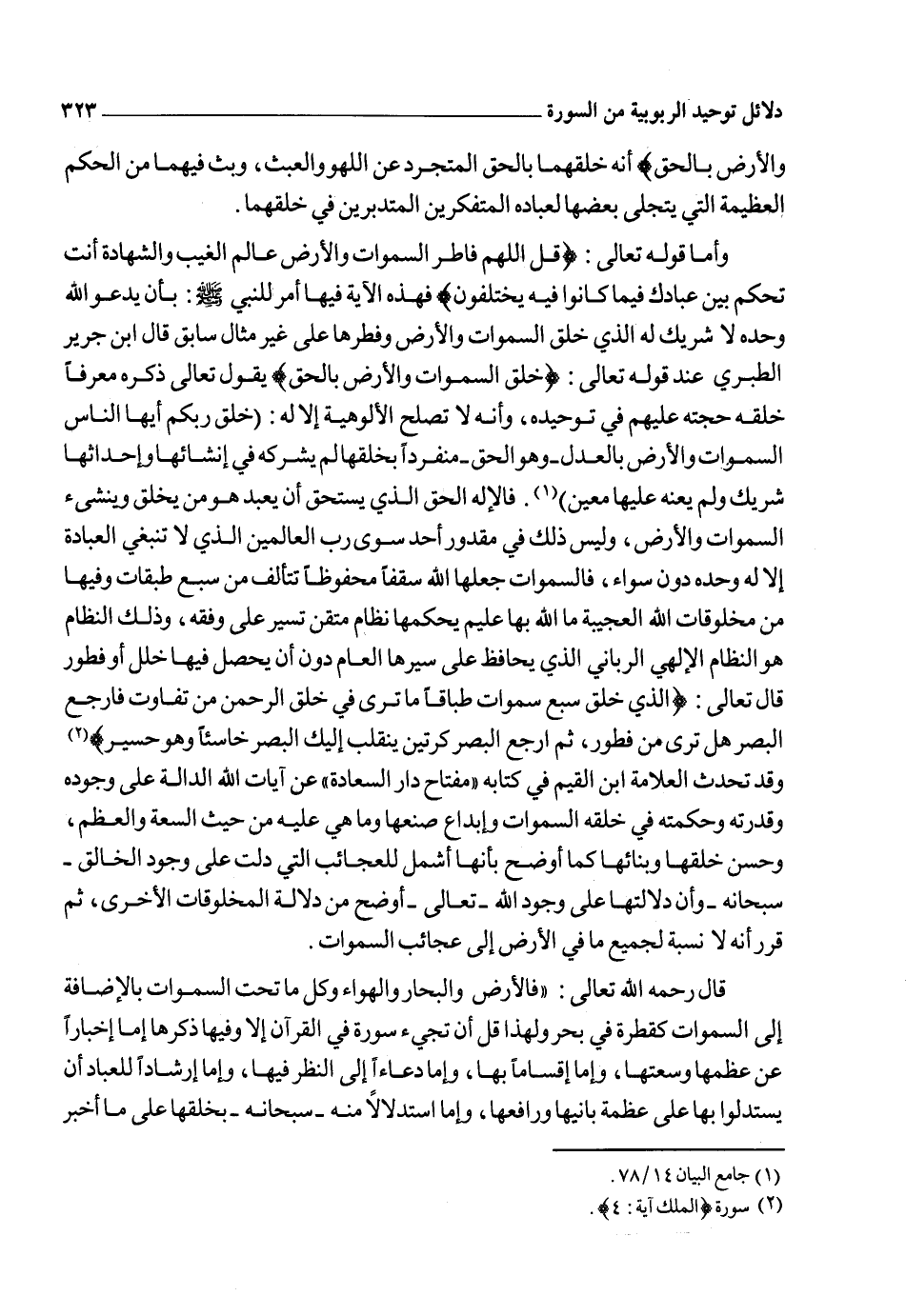 فلقد أوضح ابن القيم دلالة خلق السموات على أن للعالم خالقاً حكيماً عليماً قدره أحسن تقدير ونظمه أحسن نظام ولقد حث القرآن الكريم في غير ما آية على التفكر في خلق السموات والأرض وبين أن الذي أقامها وأمسكها إنما هو الخالق القادر على كل شيء المستحق للعبادة وحده دون سواه. قال تعالى: {اللهُ الَّذِي رَفَعَ السَّمَاوَاتِ بِغَيْرِ عَمَدٍ تَرَوْنَهَا} 3 وقال {خَلَقَ السَّمَاوَاتِ بِغَيْرِ عَمَدٍ تَرَوْنَهَا وَأَلْقَى فِي الأَرْضِ رَوَاسِيَ أَنْ تَمِيدَ بِكُمْ} 4