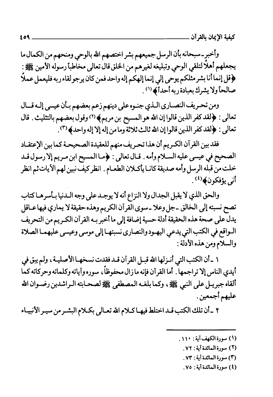 3 ـ "إن تلك الكتب المنزلة على الأنبياء السابقين ليس فيها كتاب تصح نسبته إلى الرسول الذي ينسب إليه فليس لأي كتاب منها سند صحيح متصل إلى ذلك النبي حتى يوثق بنسبته إليه فالأسفار الموجودة التي تسمى بالعهد القديم، ويطلقون عليها اسم "التوراة" إنما كان تدوينها بعد موسى عليه الصلاة والسلام وأما القرآن الكريم فهو الكتاب الوحيد الذي ثبتت نسبته بصورة قطعية إلى النبي صلى الله عليه وسلم فقد نقل إلينا هذا القرآن بسوره وآياته وطريقة ترتيبها، وكيفية تلاوته، إلى كل عصر جاء بعد عصر نزوله بالتواتر بحيث لا يشك في أن القرآن الذي نتلوه هو الذي نزله الله على نبيه محمد صلى الله عليه وسلم"3.