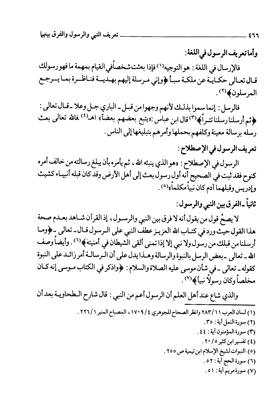 ذكر الفرق بين النبي والرسول: "ولكن الرسالة أعم من جهة نفسها فالنبوة جزء من الرسالة إذ الرسالة تتناول النبوة وغيرها بخلاف الرسل، فإنهم لا يتناولون الأنبياء وغيرهم بل الأمر بالعكس، فالرسالة أعم من جهة نفسها، وأخص من جهة أهلها" أ. هـ1.