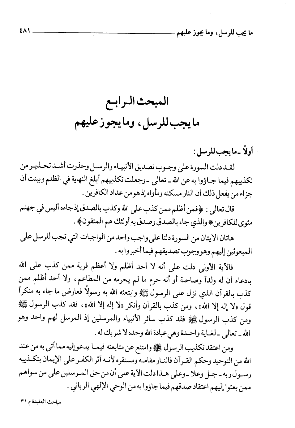 وقال تعالى في شأن خليله إبراهيم عليه السلام: {وَاذْكُرْ فِي الْكِتَابِ إِبْرَاهِيمَ إِنَّهُ كَانَ صِدِّيقاً نَبِيّاً} 2 وقال تعالى في شأن إسماعيل عليه السلام {إِنَّهُ كَانَ صَادِقَ الْوَعْدِ وَكَانَ رَسُولاً نَبِيّاً} 3 إلى غير ذلك من الآيات الدالة على أن رسل الله وأنبياءه هم أكمل البشرية صدقاً على الإطلاق، فيجب على كل مؤمن ومؤمنة اعتقاد صدق جميع أنبياء الله ورسله، ويجب الإعتقاد الجازم أنهم أدوا الأمانة وبلغوا الرسالة على الوجه الأكمل وبينوا بياناً واضحاً شافياً كافياً. لا حاجة إلى بيان سواه، ويجب على العباد طاعتهم وعدم مخالفتهم لأن ذلك من طاعة الله، وأنهم أكمل البرية خلقاً وعملاً وأنهم مختصون بفضائل لا يصل إليها أحد سواهم، وأنهم معصومون من الكذب والخيانة والكتمان والتقصير في التبليغ وعن الكبائر كلها دون الصغائر. قال شيخ الإسلام ابن تيمية رحمه الله ـ تعالى ـ "القول بأن الأنبياء معصومون من الكبائر دون الصغائر هو قول أكثر علماء الإسلام وجميع الطوائف حتى إنه قول أكثر أهل الكلام كما ذكر أبو الحسن الآمدي أن هذا القول قول أكثر الأشعرية وهو أيضاً قول أهل التفسير والحديث والفقهاء بل لم ينقل عن السلف والأئمة والصحابة والتابعين وتابعيهم إلا ما يوافق هذا القول ... " أ. هـ4.
