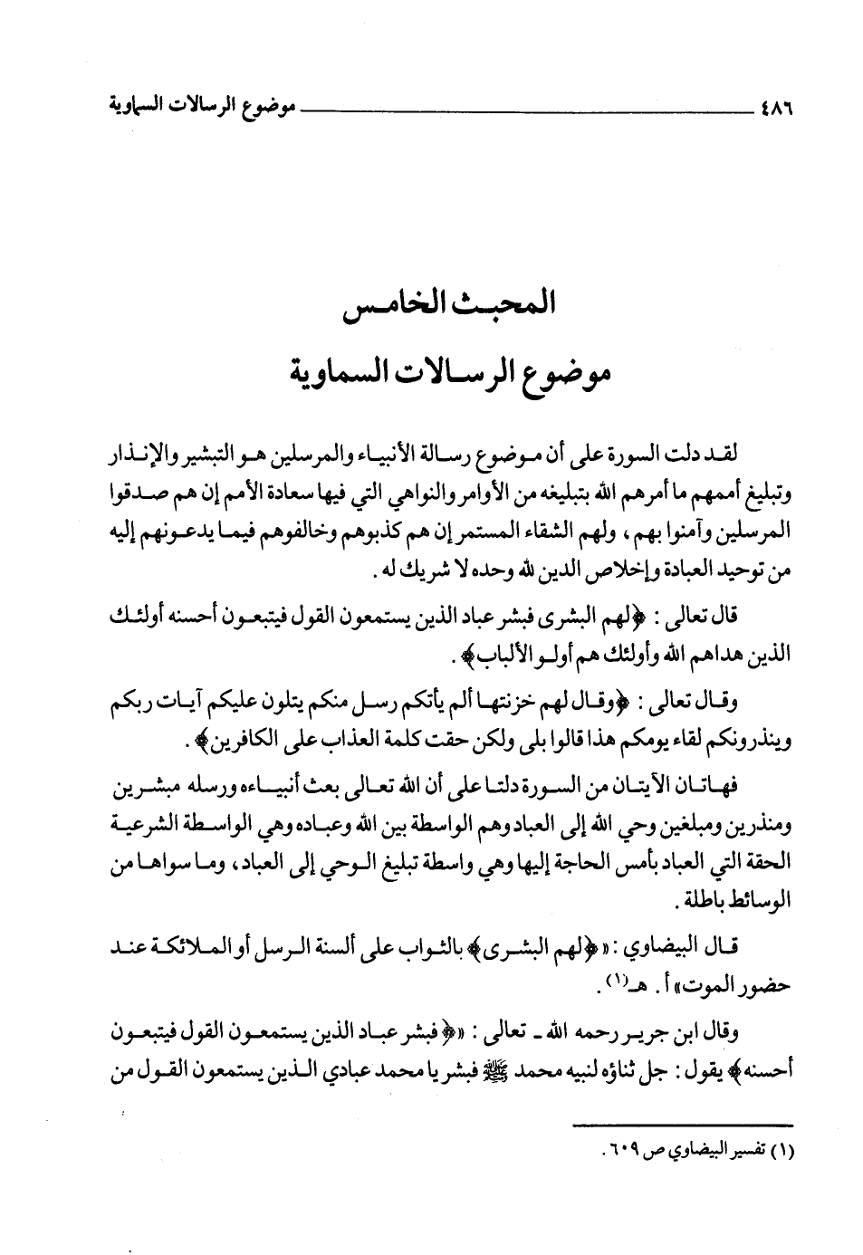 ودعوة الرسل إلى الله ـ جل وعلا ـ دائماً تقترن بالتبشير والإنذار، لأن ارتباط دعوتهم بالتبشير والإنذار وثيق جداً، فقد قصر ـ القرآن الكريم ـ مهمة الرسل عليهما في بعض آياته: قال تعالى: {وَمَا نُرْسِلُ الْمُرْسَلِينَ إِلاَّ مُبَشِّرِينَ وَمُنْذِرِينَ} 3 وقد ضرب الرسول صلى الله عليه وسلم لنفسه مثلاً في هذا فقال: "مثلي ومثل ما بعثني الله به كمثل رجل أتى قوماً فقال: يا قوم إني رأيت الجيش بعيني، وإني أنا النذير العريان فالنجاء النجاء، فأطاعه طائفة من قومه، فأدلجوا، وانطلقوا على مهلهم فنجوا، وكذبته طائفة منهم، فأصبحوا مكانهم، فصبحهم