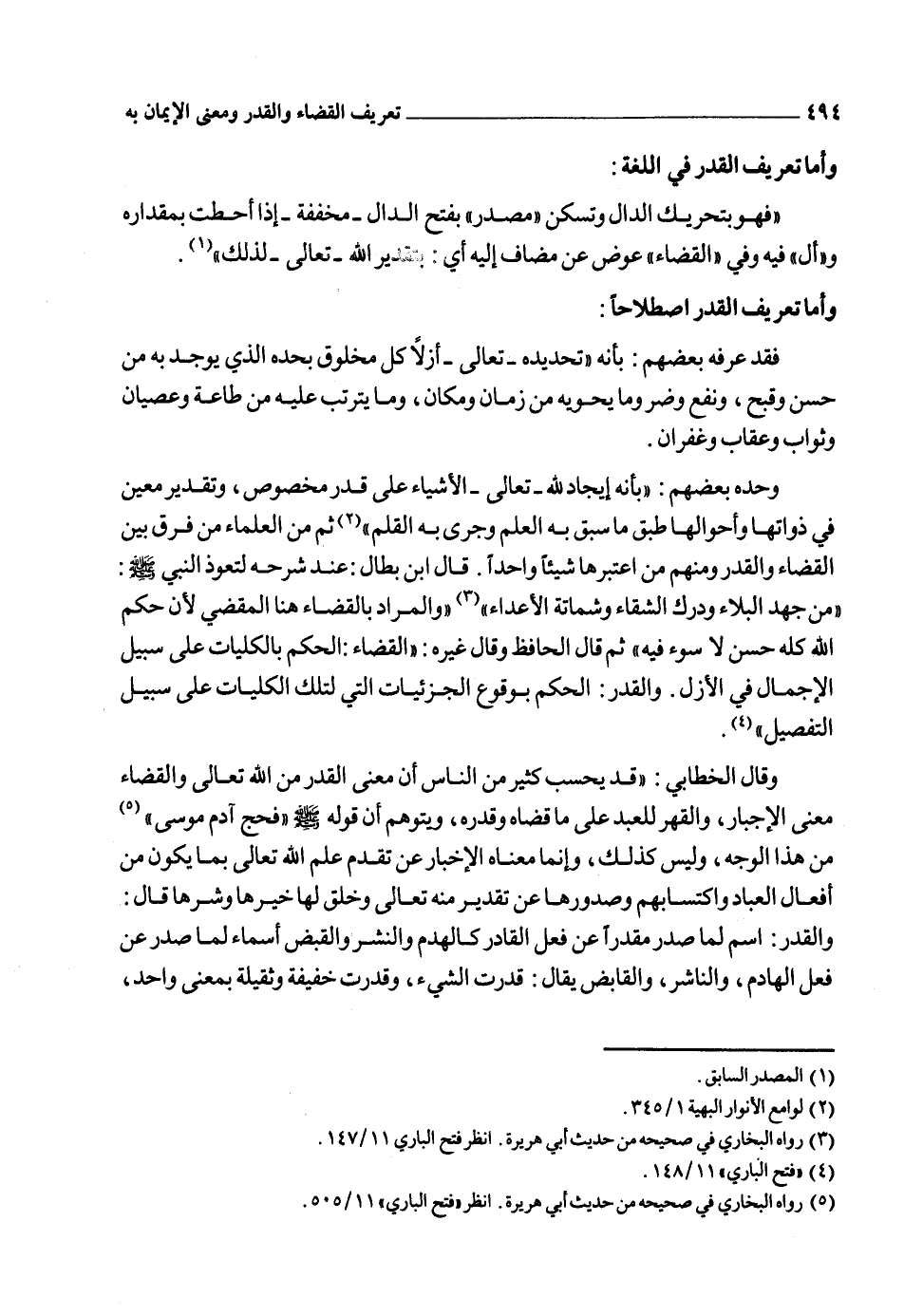 قال: والقضاء: معناه في هذا الخلق كقوله تعالى: {فَقَضَاهُنَّ سَبْعَ سَمَاوَاتٍ فِي يَوْمَيْنِ} 1 أي خلقهن، وإذا كان الأمر كذلك فقد بقي عليهم من وراء علم الله فيهم أفعالهم واكتسابهم، ومباشرتهم تلك الأمور، وملابستهم إياها عن قصد وتعمد وتقديم إرادة واختيار والحجة إنما تلزمهم بها واللائمة تلحقهم عليها قال: وجماع القول في هذا أنهما أمران لا ينفك أحدهما عن الآخر لأن أحدهما بمنزلة الأساس، والآخر بمنزلة البناء فمن رام الفصل بينهما فقد رام هدم البناء ونقضه" اهـ2. فمن جعل للقضاء والقدر تعريفاً واحداً كابن بطال والخطابي فمعناه: "هو النظام المتقن الذي وضعه الله لهذا الكون علويه وسفليه والقوانين العامة، والسنن التي ربط بها الأسباب بمسبابتها وهذا المعنى: هو الذي وردت به الكثير من الآيات القرآنية كقوله تعالى {وَكُلُّ شَيْءٍ عِنْدَهُ بِمِقْدَار} 3 وقوله ـ جل شأنه ـ {وَإِنْ مِنْ شَيْءٍ إِلاَّ عِنْدَنَا خَزَائِنُهُ وَمَا نُنَزِّلُهُ إِلاَّ بِقَدَرٍ مَعْلُومٍ} 4. وقوله تعالى: {إِنَّا كُلَّ شَيْءٍ خَلَقْنَاهُ بِقَدَرٍ} 5 قال قتادة: سألت سعيد بن المسيب عن القدر فقال: "ما قدر الله فهو قدر"6. وقد أجاب الإمام أحمد حين سئل عن القدر فقال: "القدر قدرة الله تعالى" قال ابن القيم معلقاً على تعريف الإمام أحمد: "واستحسن ابن عقيل هذا الكلام جداً وقال هذا يدل على دقة علم أحمد وتبحره في معرفة أصول الدين وهو كما قال أبو الوفاء فإن إنكار القدر إنكار لقدرة الله على خلق أعمال العباد وكتابتها وتقديرها وسلف القدرية كانوا ينكرون علمه بها وهم الذين انفق سلف الأمة على تكفيرهم"7 وفي الحقيقة أن تعريف الإمام أحمد السابق جامع مانع لمدلول القدر فالإمام أحمد رحمه الله تعالى يقصد أن القدر هو ما قرره ـ سبحانه ـ في قوله تعالى {قُلْ إِنَّ الأَمْرَ كُلَّهُ للهِ} 8 وقوله: {بِيَدِهِ مَلَكُوتُ كُلِّ شَيْءٍ} 9 وقوله: {يُدَبِّرُ الأمْرَ مَا مِنْ شَفِيعٍ إِلاَّ مِنْ بَعْدِ إِذْنِه} 10 وغير ذلك من الآيات التي