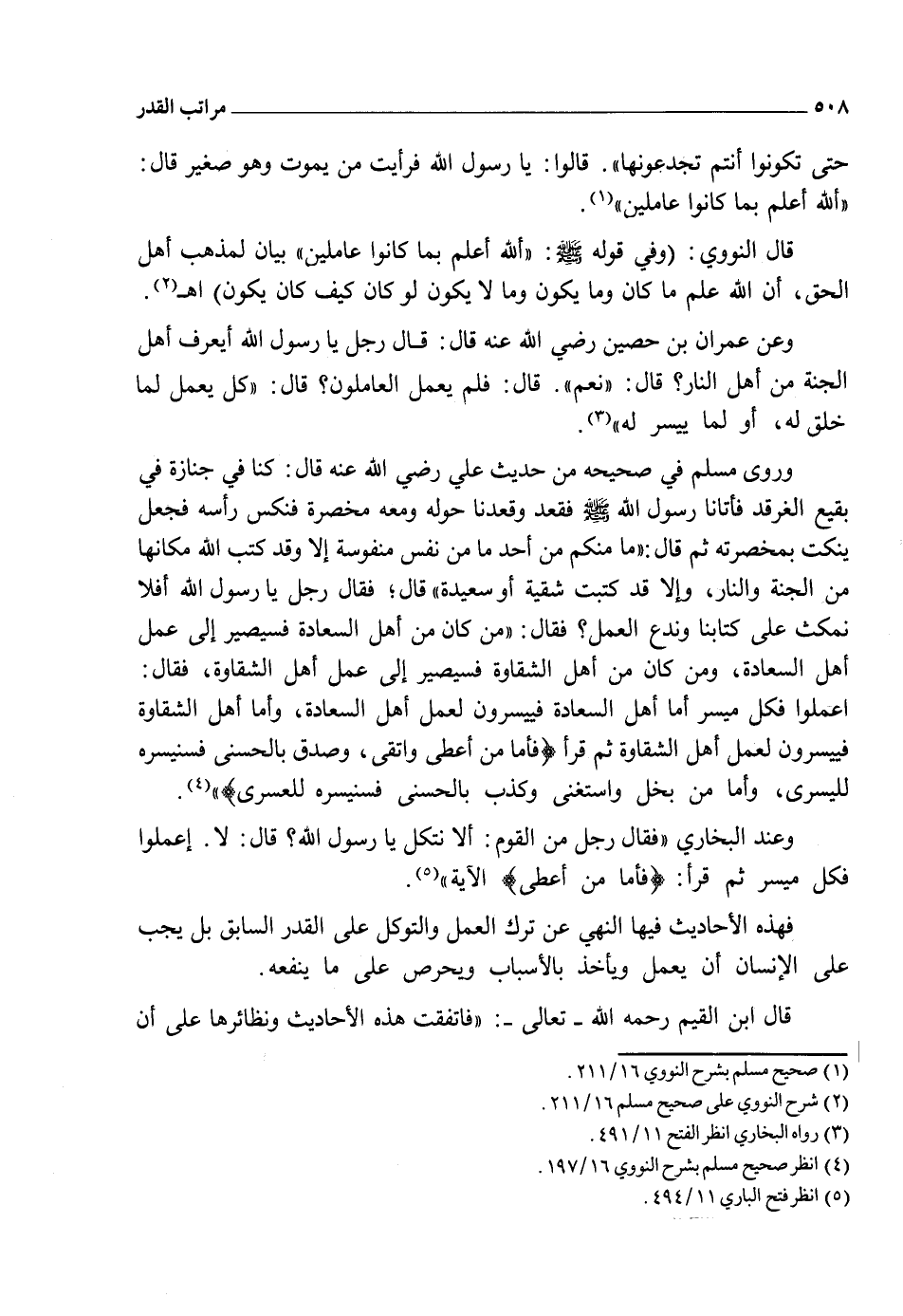 القدر السابق لا يمنع العمل ولا يوجب الإتكال عليه بل يوجب الجد والاجتهاد ولهذا لما سمع بعض الصحابة ذلك قال: ما كنت أشد اجتهاداً مني الآن، وهذا مما يدل على جلالة فقه الصحابة ودقة أفهامهم، وصحة علومهم فإن النبي صلى الله عليه وسلم أخبرهم بالقدر السابق وجريانه على الخليقة بالأسباب فإن العبد ينال ما قدر له بالسبب الذي أقدر عليه ومكن منه وهيئ له فإذا أتى بالسبب أوصله إلى القدر الذي سبق له في أم الكتاب وكلما زاد اجتهاداً في تحصيل السبب كان حصول المقدور أدنى إليه وهذا كما إذا قدر له أن يكون من أعلم أهل وزمانه فإنه لا ينال ذلك إلا بالاجتهاد والحرص على التعلم وأسبابه ... فإذا علم العبد أن مصالح آخرته مرتبطة بالأسباب الموصلة إليها كان أشد اجتهاداً في فعلها من القيام بها منه في أسباب معاشه ومصالح دنياه وقد فقه هذا كل الفقه من قال: ما كنت أشد اجتهاداً مني الآن ... فالقدر السابق معين على الأعمال وما يحث عليها ومقتض لها لا أنه مناف لها وصاد عنها وهذا موضع مزلة قدم من ثبتت قدمه فاز بالنعيم المقيم، ومن زلت قدمه عنه هوى إلى قرار الجحيم فالنبي صلى الله عليه وسلم أرشد الأمة في القدر إلى أمرين هما سببا السعادة: