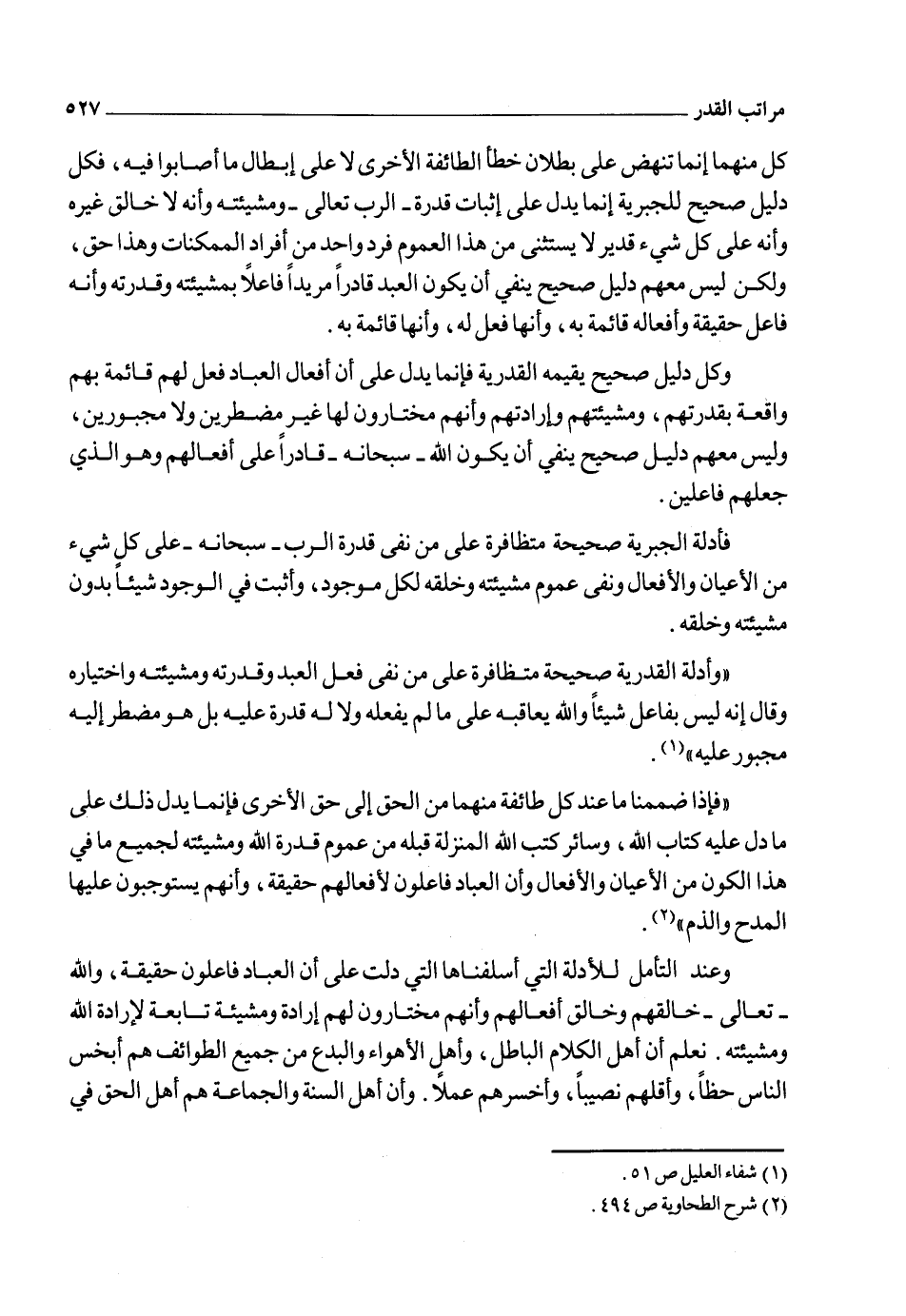 هذه المسألة وغيرها "فإنهم يثبتون قدرة الله على جميع الموجودات من الأعيان والأفعال ومشيئته العامة، وينزهونه أن يكون في ملكه ما لا يقدر عليه ولا هو واقع تحت مشيئته، ويثبتون القدر السابق وأن العباد يعملون على ما قدره الله وقضاه وفرغ منه وأنهم لا يشاؤون إلا أن يشاء الله، ولا يفعلون إلا من بعد مشيئته وأنه ما شاء كان وما لم يشأ لم يكن ولا تخصيص عندهم في هاتين القضيتين بوجه من الوجوه، والقدر عندهم قدرة الله ـ تعالى ـ وعلمه، ومشيئته وخلقه فلا تتحرك ذرة فما فوقها إلا بمشيئته وعلمه، وقدرته فهم المؤمنون "بلا حول ولا قوة إلا بالله" على الحقيقة إذا قالها غيرهم على المجاز إذ العالم علويه، وسفليه، وكل حي يفعل فعلاً فإن فعله بقوة فيه على الفعل وهو في حول من ترك إلى فعل ومن فعل إلى ترك، ومن فعل إلى فعل، وذلك كله بالله ـ تعالى ـ ويؤمنون بأن من يهده الله فلا مضل له، ومن يضلل فلا هادي له وأنه هو الذي يجعل المسلم مسلماً والكافر كافراً والمصلي مصلياً والمتحرك متحركاً وهو الذي يسير عبده في البر والبحر وهو المسير والعبد السائر ... ويثبتون مع ذلك قدرة العبد وإرادته، واختياره وفعله حقيقة لا مجازاً وهم متفقون على أن الفعل غير المفعول ... فحركات العباد واعتقاداتهم أفعال لهم حقيقة وهي مفعولة لله ـ سبحانه ـ مخلوقة له حقيقة والذي قام بالرب ـ عز وجل ـ علمه وقدرته ومشيئته وتكوينه والذي قام بهم هو فعلهم وكسبهم وحركاتهم وسكناتهم فهم المسلمون المصلون القائمون القاعدون حقيقة، وهو ـ سبحانه ـ هو المقدر لهم على ذلك القادر عليه الذي شاءه منهم وخلقه لهم ومشيئتهم وفعلهم بعد مشيئته فما يشاؤون إلا أن يشاء الله، وما يفعلون إلا أن يشاء الله، وإذا قارن الإنسان بينه وبين المذاهب الأخرى وجد أنه المذهب الوسط السوي ووجد غيره من المذاهب خطوطاً عن يمينه وعن شماله فقريب منه، وبعيد"1.