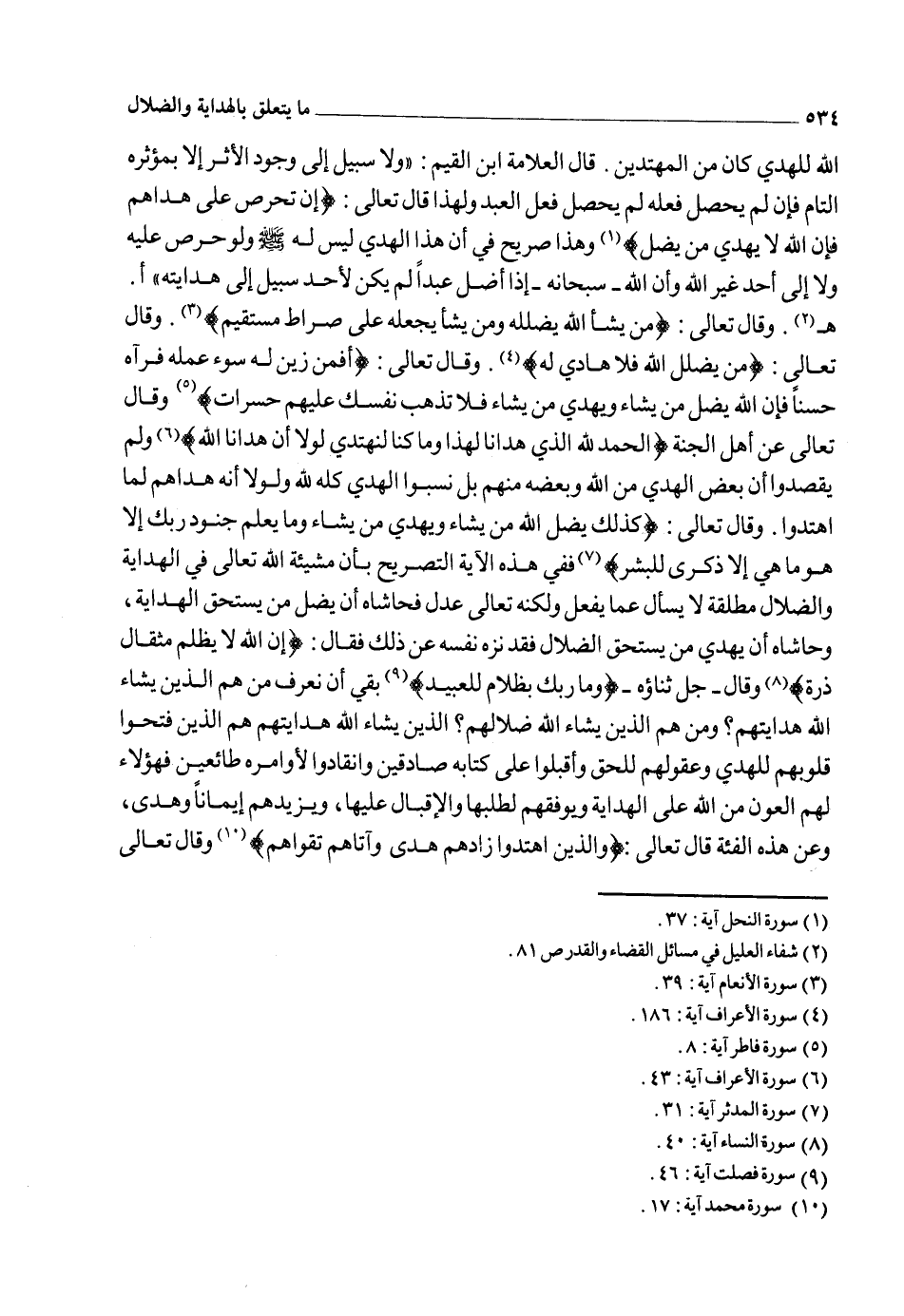 ومما يجب أن يعلم أن الله تعالى إنما يضل من يضل من خلقه إنما يكون ذلك بعد العذر إليهم بتبيين طرق الهدى ويمنحهم القدرة الكفاية التي تمكنهم من السير عليها فإذا قدم العبد ـ بعد العلم ـ الضلال على الهدى ولاه الله ما تولى وكان ذلك بمحض عدله سبحانه لا ظلم فيه قال تعالى: {وَمَا كَانَ اللهُ لِيُضِلَّ قَوْماً بَعْدَ إِذْ هَدَاهُمْ حَتَّى يُبَيِّنَ لَهُمْ مَا يَتَّقُونَ} 7 والذي يؤثر طلب الهداية والرغبة فيها ويأخذ بالأسباب التي توصله إليها فإنه سيجد من الله عوناً على تحصيلها وتحقيقها وذلك من رحمة الله لعباده وفضله عليهم، ومن يؤثر الضلالة ويرغب فيها ويسعى جاهداً في طلبها ويعمل بالأسباب التي توصله إليها تمت له فلم يجد من الله تعالى صارفاً عنها وهذا من عدل الله في عباده وحسن تدبيره لهم.