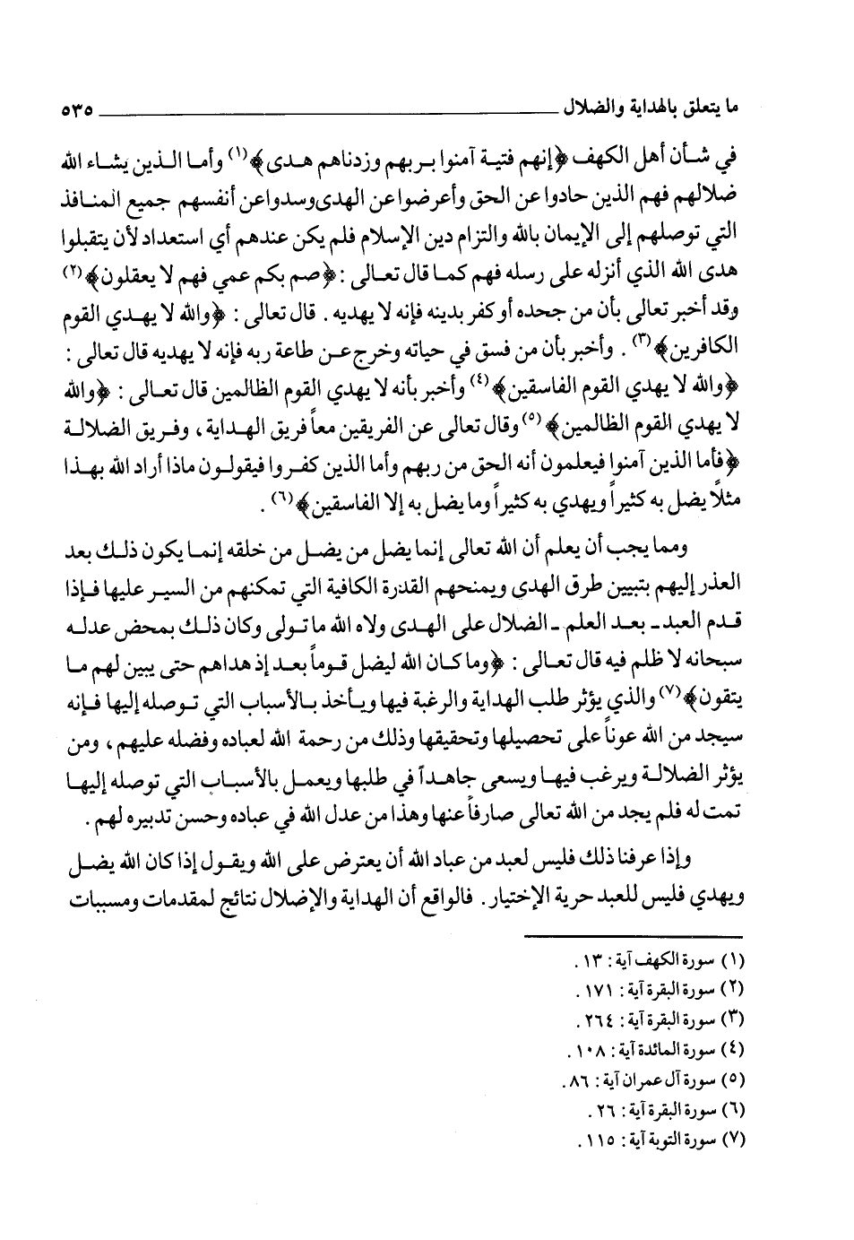قال تعالى: {وَيَهْدِي إِلَيْهِ مَنْ أَنَابَ} 1 وقال تعالى: {وَالَّذِينَ جَاهَدُوا فِينَا لَنَهْدِيَنَّهُمْ سُبُلَنَا} 2 فالهداية الحاصلة للمؤمنين إنما هي ثمرة مجاهدتهم لأنفسهم وإنابتهم إلى الله واستمساكهم بإرشاده ووحيه. قال تعالى في شأن الإضلال {كَذَلِكَ يَطْبَعُ اللهُ عَلَى كُلِّ قَلْبِ مُتَكَبِّرٍ جَبَّارٍ} 3 وقال تعالى: {فَلَمَّا زَاغُوا أَزَاغَ اللهُ قُلُوبَهُمْ وَاللهُ لا يَهْدِي الْقَوْمَ الْفَاسِقِينَ} 4 وقال تعالى: {بَلْ طَبَعَ اللهُ عَلَيْهَا بِكُفْرِهِمْ فَلا يُؤْمِنُونَ إِلاَّ قَلِيلاً} 5.