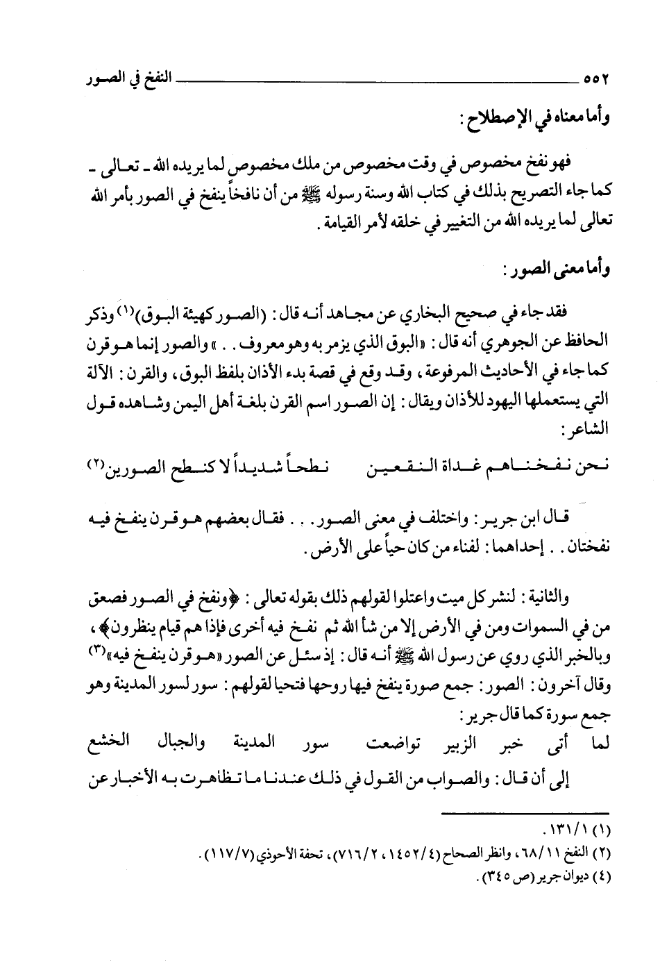 رسول الله صلى الله عليه وسلم أنه قال: "إن إسرافيل قد التقم الصور وحنى جبهته ينتظر متى يؤمر فينفخ" 1 وأنه قال: "الصور قرن ينفخ فيه" اهـ2.