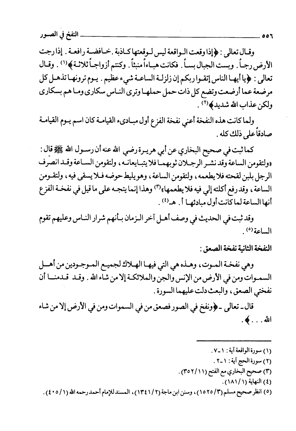"هذه النفخة هي الثانية وهي نفخة الصعق وهي التي يموت بها الأحياء من أهل السموات والأرض إلا من شاء الله" أ. هـ2.