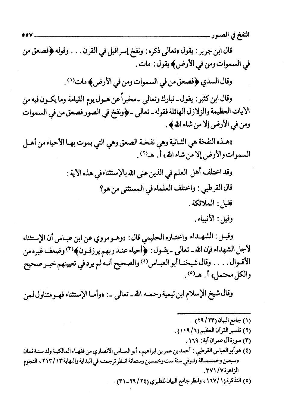 وقال العلامة ابن القيم: عند قوله تعالى: {وَنُفِخَ فِي الصُّورِ فَصَعِقَ مَنْ فِي السَّمَاوَاتِ وَمَنْ فِي الأَرْضِ إِلاَّ مَنْ شَاءَ اللهُ} فقد استثنى الله ـ سبحانه ـ بعض من في السموات ومن في الأرض من هذا الصعق.