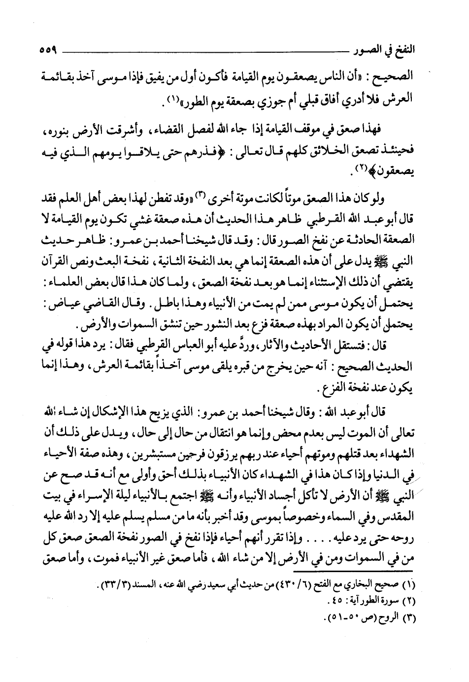 وقال أبو عبد الله القرطبي: إن حمل الحديث على صعقة الخلق يوم القيامة فلا إشكال، وإن حمل على صعقة الموت عند نفخ الصور وصرف ذكر يوم القيامة إلى أنه أراد أوائله، فيكون المعنى: "إذا نفخ في الصور نفخة البعث كنت أول من يرفع رأسه فإذا بموسى آخذ بقائمة من قوائم العرش فلا أدري أفاق قبلي أم جوزي بصعقة الطور"2.