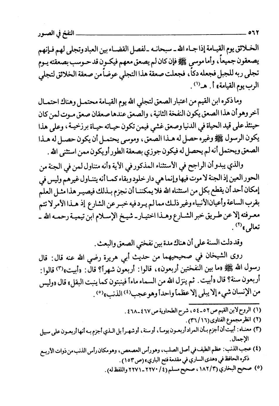 فالمراد بالنفختين هنا نفخة الصعق ونفخة القيام للبعث والنشور، ويؤيد ذلك إنزال الماء بينهما وذكر عجب الذنب الذي منه يخلق الإنسان وفيه يركب خلقه عند بعثه يوم القيامة1.