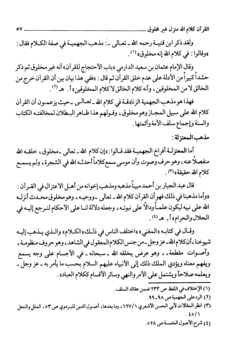وقال أيضاَ: "ولا خلاف بين أهل العدل في أن القرآن مخلوق محدث مفعول لم يكن، ثم كان وأنه غير الله ـ عز وجل ـ وأنه أحدثه بحسب مصالح العباد، وهو قادر على أمثاله وأنه يوصف بأنه مخبر به، وقائل، وآمر، وناه من حيث فعله وكلهم أنه ـ عز وجل ـ متكلم به" أ. هـ1.