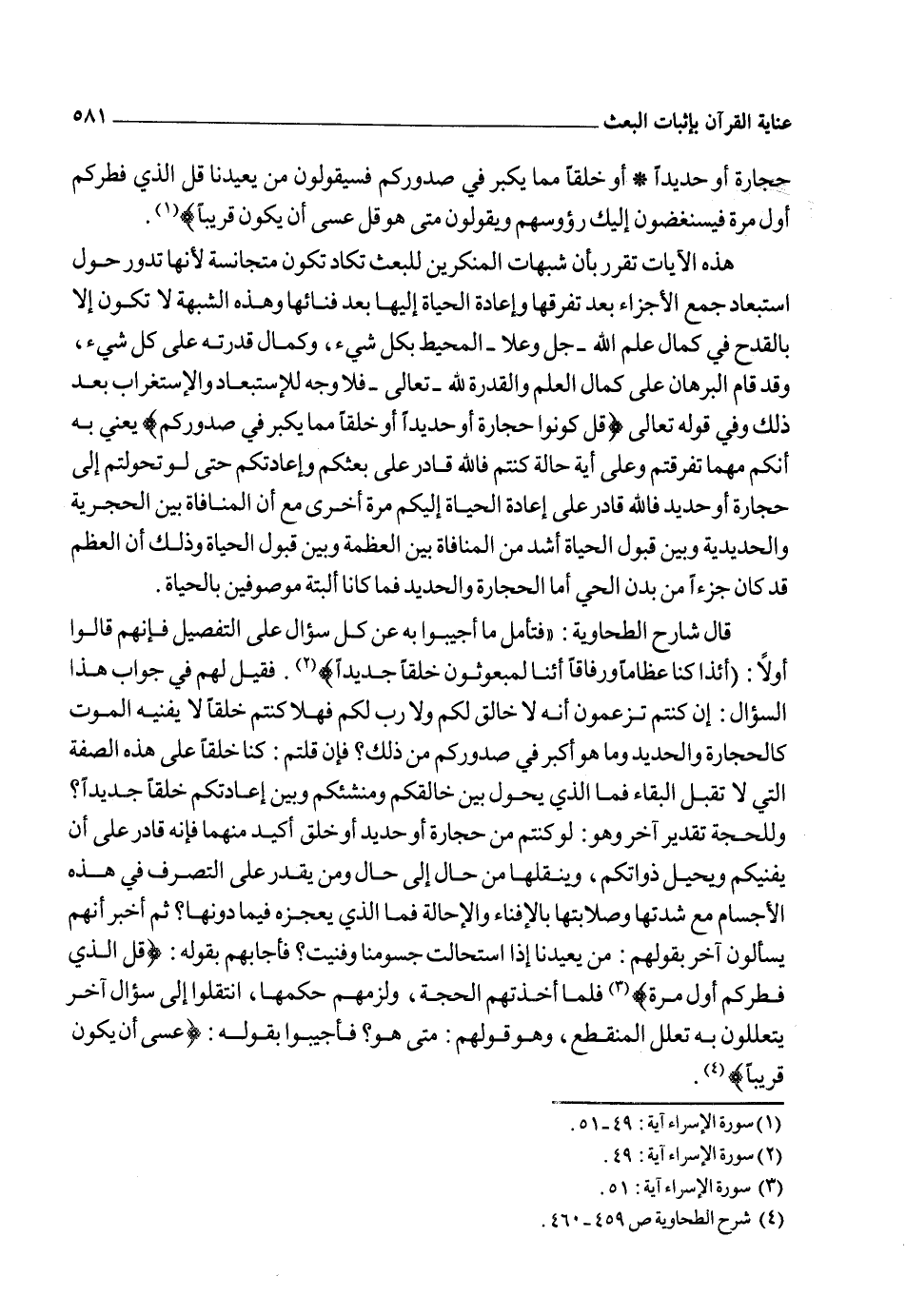 1 ـ قال تعالى: {وَقَالُوا أَإِذَا كُنَّا عِظَاماً وَرُفَاتاً أَإِنَّا لَمَبْعُوثُونَ خَلْقاً جَدِيداً أَوَلَمْ يَرَوْا أَنَّ اللهَ الَّذِي خَلَقَ السَّمَاوَاتِ وَالأَرْضَ قَادِرٌ عَلَى أَنْ يَخْلُقَ مِثْلَهُمْ وَجَعَلَ لَهُمْ أَجَلاً لا رَيْبَ فِيهِ} 1.