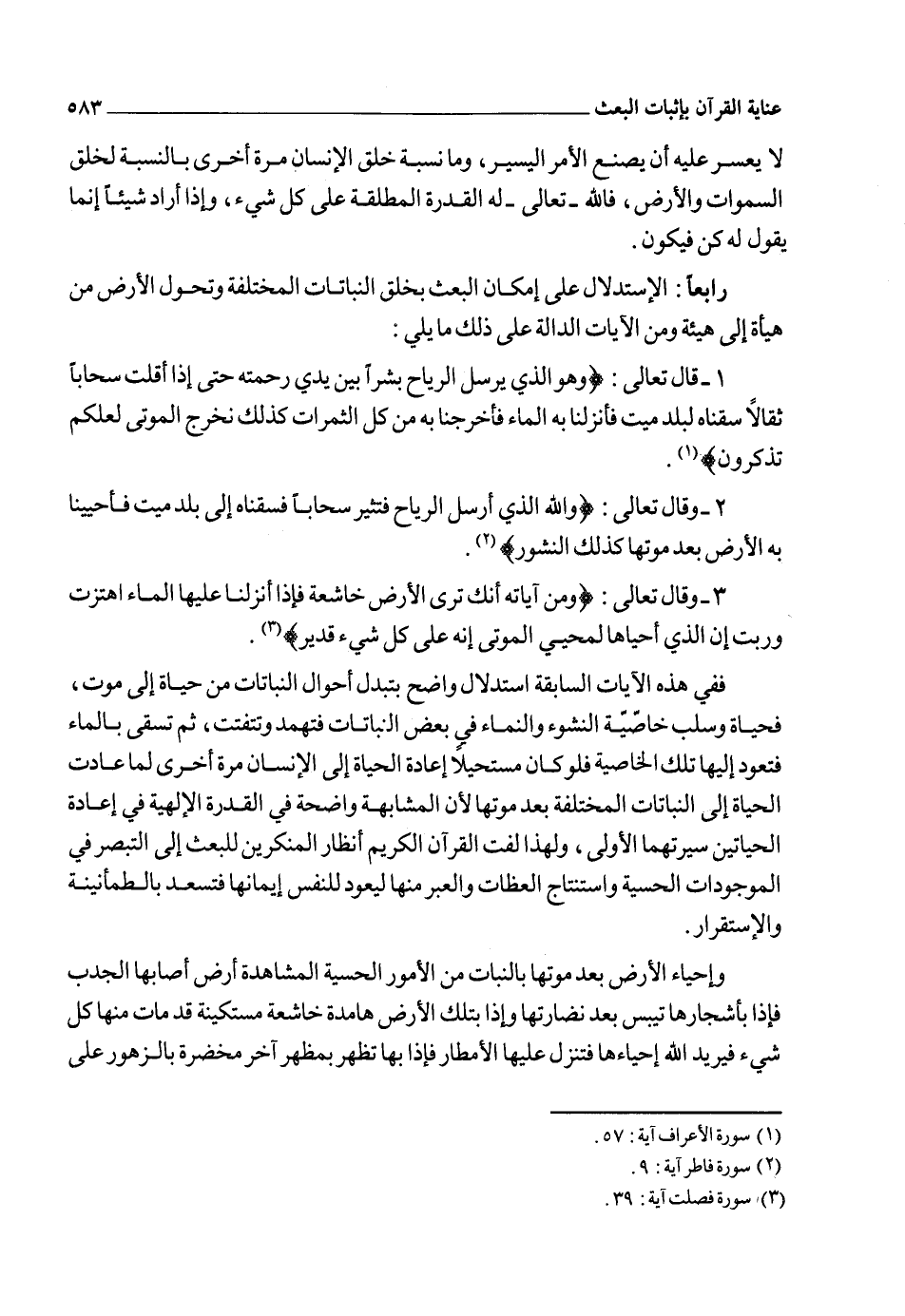 5- هذه الطرق التي استعملها القرآن لإثبات البعث بعد الموت أشار إليها بإيجاز شيخ الإسلام ابن تيمية. انظر "مجموع الفتاوى" 9/224 ـ 225. وانظر النهاية لابن كثير 1/165 ـ 168.