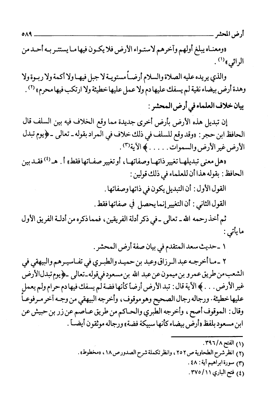 وبعد أن فرغ الحافظ من نقله حجج القول الأول وهو قول من قال: "بأن التغيير يحصل في ذات أرض الدنيا وصفاتها" شرع في ذكر أدلة الفريق الثاني القائل بأن التغيير يحصل في صفات الأرض وليس في ذاتها فقال: "وأما من ذهب إلى أن التغيير إنما يقع في صفات الأرض دون ذاتها فمستنده ما أخرجه الحاكم عن عبد الله بن عمرو قال: "إذا كان يوم القيامة مدت الأرض مد الأديم وحشر الخلائق".