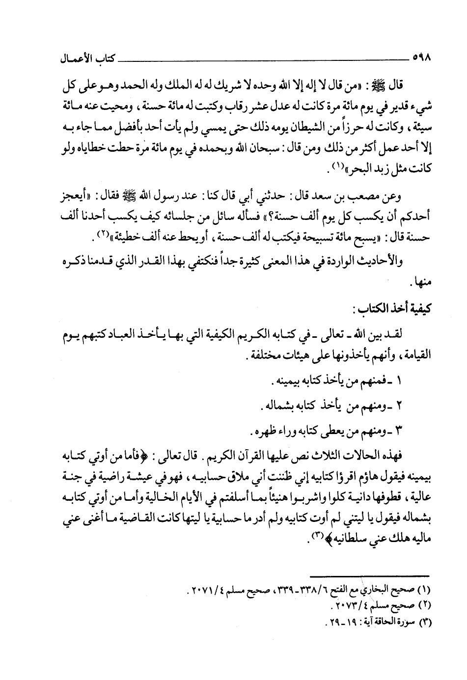 فالقرآن الكريم حصر الكيفية في أخذ الكتب على ثلاث حالات فقط هذا على حسب ظاهر الآيات، ولكنها في واقع الأمر ترجع إلى حالتين إما أن يكون الأخذ باليمين وهذه للسعداء من أهل التوحيد والإيمان، وإما أن يكون الأخذ بالشمال وهذه حالة أهل الشقاوة والخسران ولذلك حصل الخلاف بين العلماء في الحالة الثالثة وهي حالة إيتاء الكافر كتابه من وراء ظهره ولكن نتيجة الخلاف يرجع إلى أن الكافر يتناول كتابه بشماله، وإليك بعض أقوال العلماء في ذلك: