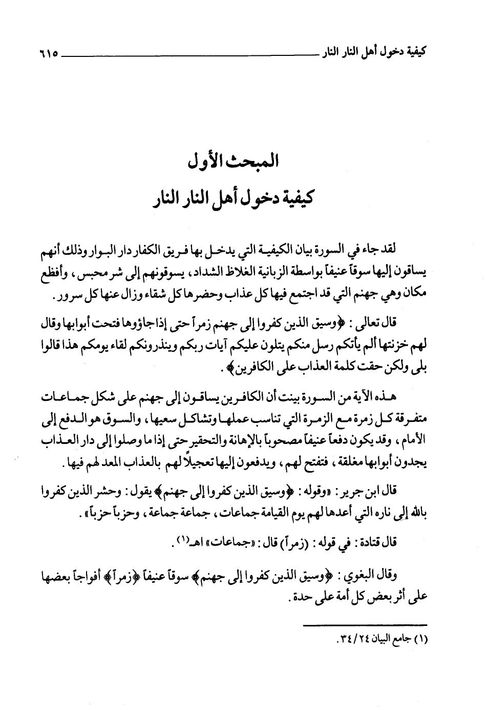 وقال ابن كثير عند قوله تعالى: {وَسِيقَ الَّذِينَ كَفَرُوا إِلَى جَهَنَّمَ زُمَراً} "يخبر ـ تعالى ـ عن حال الأشقياء الكفار كيف يساقون إلى النار وإنما يساقون سوقاً عنيفاً بزجر وتهديد ووعيد" اهـ2.
