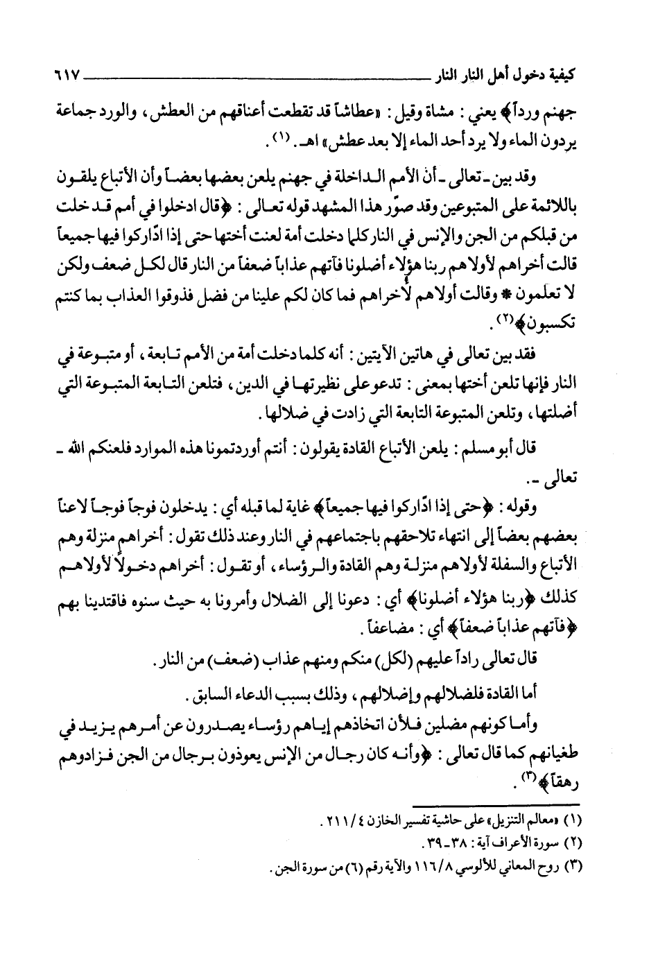 وقد أخبر تعالى أن أهل النار يلقون فيها أفواجاً: كما قال تعالى: {تَكَادُ تَمَيَّزُ مِنَ الْغَيْظِ كُلَّمَا أُلْقِيَ فِيهَا فَوْجٌ سَأَلَهُمْ خَزَنَتُهَا أَلَمْ يَأْتِكُمْ نَذِيرٌ * قَالُوا بَلَى قَدْ جَاءَنَا نَذِيرٌ فَكَذَّبْنَا وَقُلْنَا مَا نَزَّلَ اللهُ مِنْ شَيْءٍ إِنْ أَنْتُمْ إِلاَّ فِي ضَلالٍ كَبِيرٍ * وَقَالُوا لَوْ كُنَّا نَسْمَعُ أَوْ نَعْقِلُ مَا كُنَّا فِي أَصْحَابِ السَّعِيرِ * فَاعْتَرَفُوا بِذَنْبِهِمْ فَسُحْقاً لأَصْحَابِ السَّعِيرِ} 1.