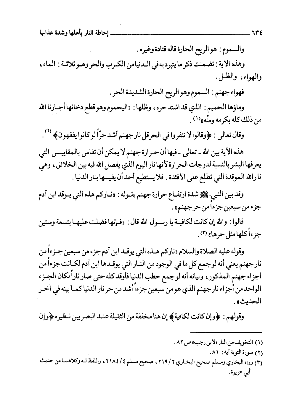 كَانَتْ لَكَبِيرَةً إِلاَّ عَلَى الَّذِينَ هَدَى اللهُ} 1 أي: "إنها كانت كافية فأجابهم النبي صلى الله عليه وسلم بأنها كما فضلت عليها في المقدار والعدد بتسعة وستين وفضلت عليها أيضاً: في شدة الحر بتسعة وستين ضعفاً"2.