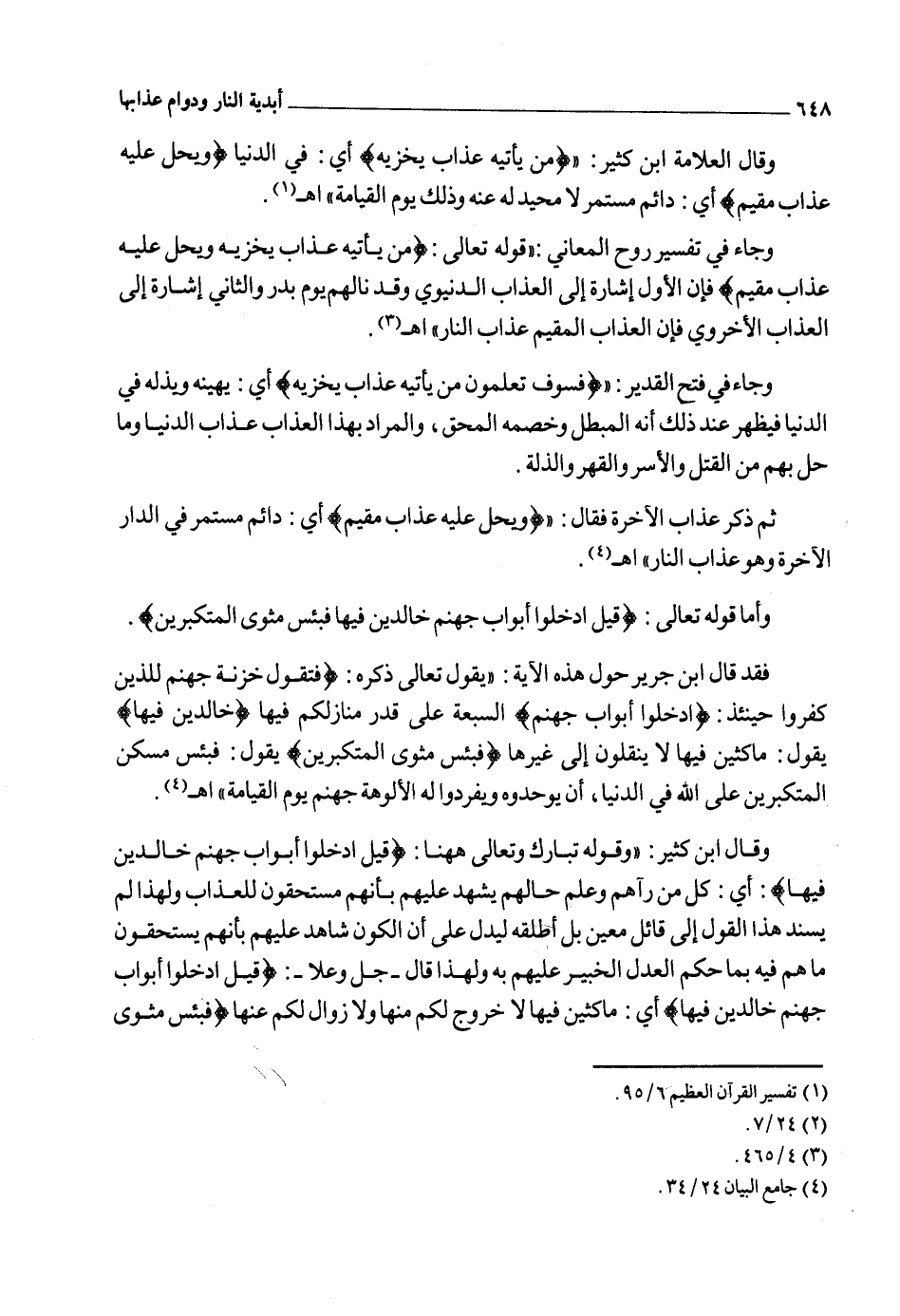 فهذه الآيات القرآنية دلت على أن عذاب جهنم لا انقطاع له، وأن أهلها من الكفار