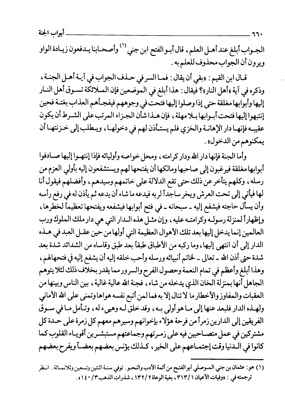وأما أهل النار فإنهم لما انتهوا إليها على تلك الحال من الهم والغم والحزن وفتحت لهم أبوابها وقفوا عليها وزيدوا على ما هم عليه توبيخ خزنتها وتكبيتهم لهم بقولهم {أَلَمْ يَأْتِكُمْ رُسُلٌ مِنْكُمْ يَتْلُونَ عَلَيْكُمْ آيَاتِ رَبِّكُمْ وَيُنْذِرُونَكُمْ لِقَاءَ يَوْمِكُمْ هَذَا} فاعترفوا وقالوا {بَلَى} فبشروهم بدخولها والخلود فيها وأنها بئس المثوى لهم، وتأمل قول خزنة الجنة لأهلها "ادخلوها" وقول خزنة النار لأهلها "ادخلوا أبواب جهنم" تجد تحته سراً لطيفاً ومعنى بديعاً لا يخفى على المتأمل وهو أنها لما كانت دار العقوبة وأبوابها أفظع شيء وأشده حراً وأعظمه عما يستقبل فيها الداخل من العذاب ما هو أشد منها ويدنوا من الغم والخزي والحزن والكرب بدخول الأبواب فقيل: ادخلوا أبوابها صغاراً لهم وإذلالاً وخزياً، ثم قيل لهم: لا يقتصر بكم على مجرد دخول الأبواب الفظيعة ولكن وراءها الخلود في النار، وأما الجنة فهي دار الكرامة والمنزل الذي أعده الله لأوليائه فبشروا من أول وهلة بالدخول إلى المقاعد والمنازل والخلود فيها، وتأمل قوله سبحانه {جَنَّاتِ عَدْنٍ مُفَتَّحَةً لَهُمُ الأَبْوَابُ مُتَّكِئِينَ فِيهَا يَدْعُونَ فِيهَا بِفَاكِهَةٍ كَثِيرَةٍ وَشَرَابٍ} 1. كيف تجد تحته معنى بديعاً وهو أنهم إذا دخلوا الجنة لم تغلق أبوابها عليهم بل تبقى مفتحة كما هي، وأما النار فإذا دخلها أهلها أغلقت عليهم أبوابها كما قال تعالى {إِنَّهَا عَلَيْهِمْ مُؤْصَدَةٌ} 2 أي مطبقة مغلقة ومنه سمي الباب "وصيداً" وهي {مُؤْصَدَةٌ فِي عَمَدٍ مُمَدَّدَةٍ} قد جعلت العمد ممسكة للأبواب من خلفها كالحجر العظيم الذي يجعل خلف الباب.