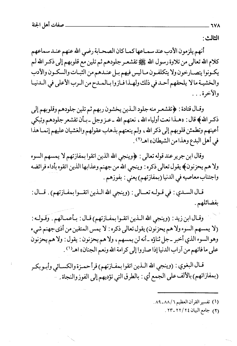 وقال ابن كثير: {وَيُنَجِّي اللهُ الَّذِينَ اتَّقَوْا بِمَفَازَتِهِمْ} أي: بما سبق لهم من السعادة، والفوز عند الله {لا يَمَسُّهُمُ السُّوءُ} أي: يوم القيامة، {وَلا هُمْ يَحْزَنُونَ} أي: لا يحزنهم الفزع الأكبر بل هم آمنون من كل فزع مزحزحون عن كل شر نائلون كل خير" اهـ3.