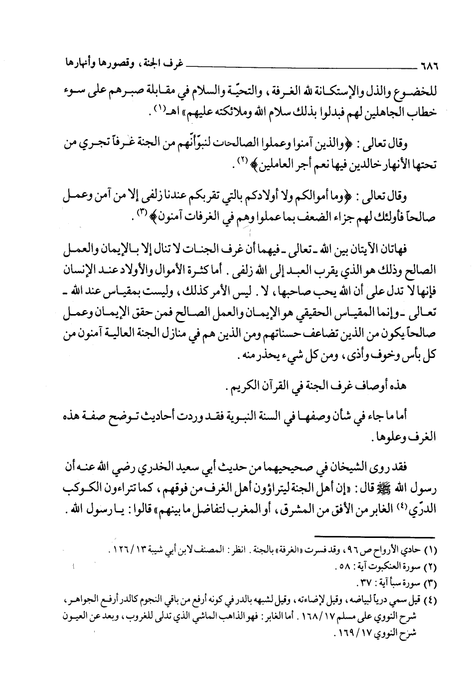 قال أبو عبد الله القرطبي: "وقوله والذي نفسي بيده رجال آمنوا بالله وصدقوا المرسلين" ولم يذكر عملاً ولا شيئاً سوى الإيمان والتصديق للمرسلين ذلك ليعلم أنه عنى الإيمان البالغ وتصديق المرسلين من غير سؤال آية ولا تلجلج، وإلا فكيف تنال الغرفات بالإيمان والتصديق الذي للعامة، ولو كان كذلك كان جميع الموحدين في أعالي الغرفات، وأرفع الدرجات وهذا محال، وقد قال الله تعالى: {أُولَئِكَ يُجْزَوْنَ الْغُرْفَةَ بِمَا صَبَرُوا} 2.