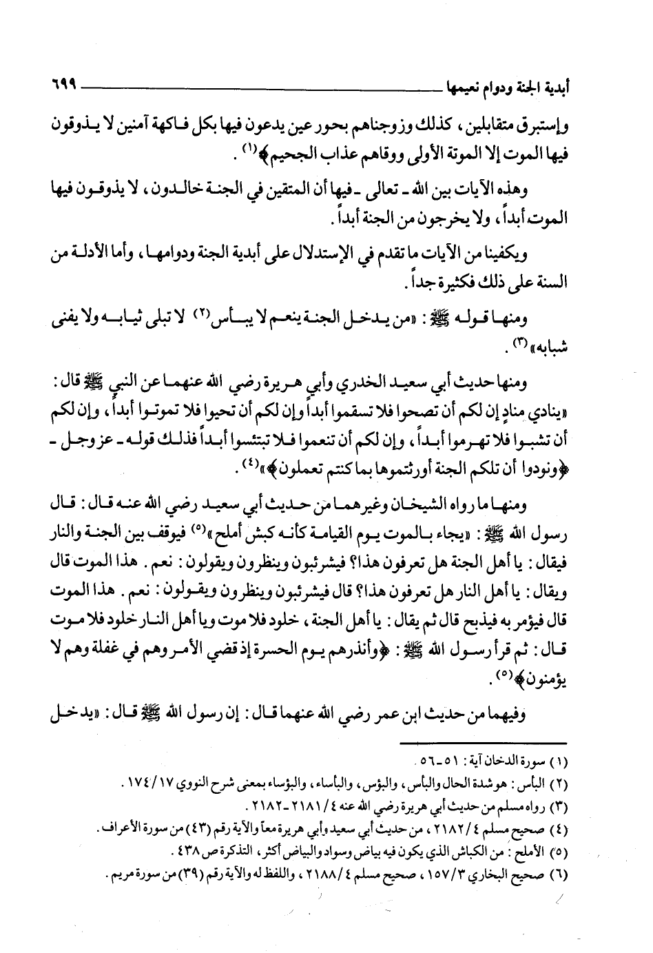 قال النووي: "مذهب أهل السنة وعامة المسلمين أن أهل الجنة يأكلون فيها ويشربون، يتنعمون بذلك وبغيره من ملاذ وأنواع نعيمها تنعماً دائماً لا آخر له ولا انقطاع أبداً، وأن تنعمهم بذلك على هيئة تنعم أهل الدنيا إلا ما بينهما من التفاضل في اللذة والنفاسة التي لا يشارك نعيم الدنيا إلا في التسمية وأصل الهيئة، وإلا في أنهم لا يبولون، ولا يتغوطون ولا يمتخطون ولا يبصقون، وقد دلت دلائل القرآن والسنة ... أن نعيم الجنة دائم لا انقطاع له أبداً" أهـ2.