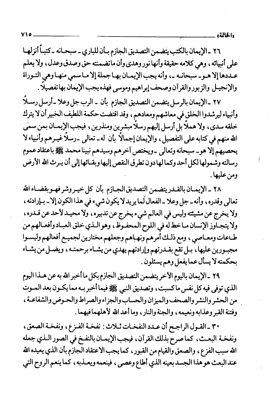 31 ـ الجنة والنار مخلوقتان أبديتان لا تفنيان ولا تبيدان ومن زعم أنهما يفنيان فقد خالف الكتاب والسنة وإجماع الأمة.