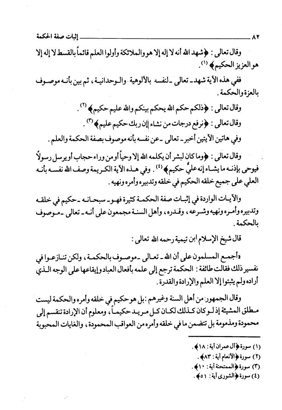 والقول بإثبات هذه الحكمة ليس هو قول المعتزلة ومن وافقهم من الشيعة1 فقط بل هو قول جماهير طوائف المسلمين من أهل التفسير والفقه والحديث والتصوف والكلام وغيرهم فأئمة الفقهاء متفقون على إثبات الحكمة والمصالح في أحكامه الشرعية وإنما تنازع في ذلك طائفة من نفاة القدر وغير نفاته، وكذلك ما في خلقه من المنافع والحكم والمصالح لعباده معلوم" أ. هـ 2.