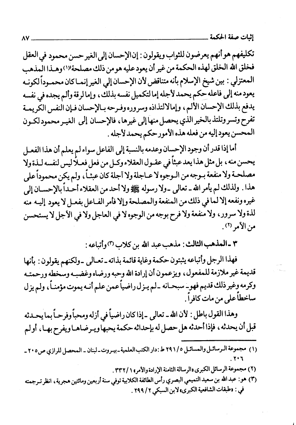فهذه المذاهب الثلاثة كما رأينا ليس عند أصحابها أدلة قوية تثبت أقوالهم في صفة الحكمة، بل كلها انتحالات فلسفية مبنية على شفا جرف هاوٍ كلها انهارت بما أورد عليها من مناقشات صارمة فلم يبق إذن إلا المذهب الحق الصحيح وهو ما عليه أهل السنة الذي شهدت له النصوص الكثيرة من أن لله ـ تعالى ـ حكمة تتعلق به يحبها ويرضاها ويفعل لأجلها فهو ـ سبحانه ـ وتعالى يفعل ما يفعل لحكمة يعلمها وهو يعلِّم العباد أو بعضهم من حكمته ما يطلعهم عليه وقد لا يعلمون ذلك والأمور العامة التي يفعلها تكون لحكمة عامة ورحمة عامة كإرساله محمداً صلى الله عليه وسلم فإنه كما قال تعالى: {وَمَا أَرْسَلْنَاكَ إِلاَّ رَحْمَةً لِلْعَالَمِينَ} 2 ولو قال إنسان: ما رسالة النبي صلى الله عليه وسلم تضررت منها طوائف كثيرة من الناس كالذين كذبوه من أهل الكتاب والمشركين فالرد على هذا أنهم انتفعوا بحسب الإمكان حيث أضعف شرهم الذي كانوا يعملونه ولولا الرسالة بإظهار الحجج القاطعة، والآيات البينة التي زلزلت ما في قلوبهم، وبالجهاد والجزية صاروا أذلاء صاغرين لكان شرهم أشد وأعظم والضرر الذي حصل لهم شيء يسير بجانب ما حصل لهم من النفع الكثير، ومثل ذلك كنزول المطر الذي يعم نفعه البلاد والعباد، ويحصل منه خراب بعض البيوت، أو حبس بعض المسافرين والمكتسبين فما كان نفعه ومصلحته عامة كان خيراً مقصوداً ورحمة محبوبة ولو تضرر به بعض الناس فكل ما حدث في الوجود من الضرر لا بد أن يكون فيه حكمة كما قال ـ سبحانه ـ {صُنْعَ اللهِ الَّذِي أَتْقَنَ كُلَّ شَيْءٍ} 3، وكما قال ـ سبحانه ـ: {الَّذِي أَحْسَنَ كُلَّ شَيْءٍ خَلَقَهُ} 4 والضرر الذي تحصل به حكمة مطلوبة لا يكون شراً مطلقاً، وإن كان شراً بالنسبة إلى من تضرر به، ولهذا لا يأتي في كلام الله وكلام رسوله إضافة الشر وحده إلى الله وإنما يذكر على أحد وجوه ثلاثة: