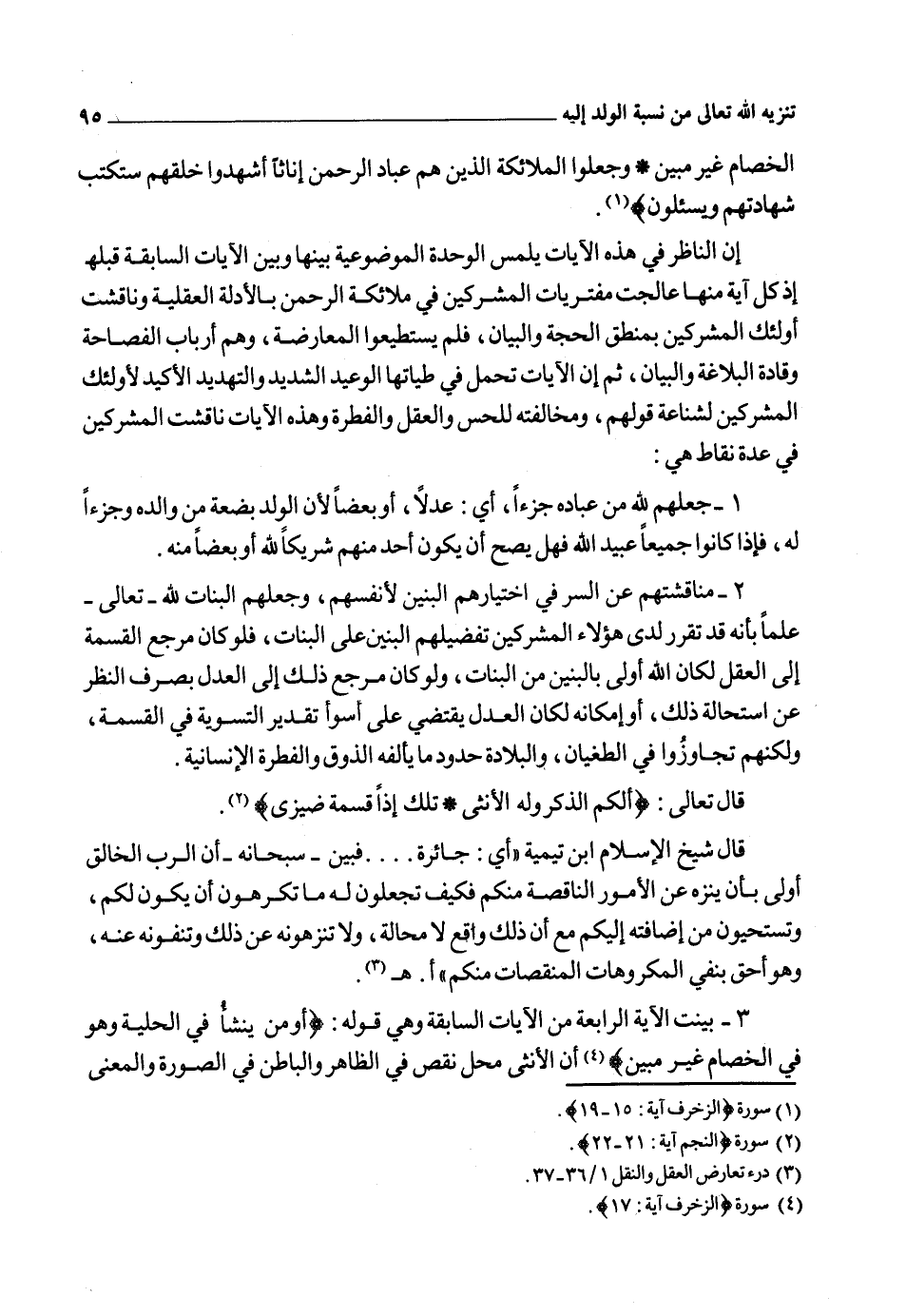 فيكمل نقص ظاهرها وصورتها بلبس الحلي وما في معناه ليجبر ما فيها من نقص فإذا كانت الأنثى محل نقص فما وجه نسبتها إلى الله ولقد بين القرآن الكريم أنهم ليس لهم دليل على صحة دعواهم حيث أنه نفى عنهم طرق العلم الثلاث التي هي: الحس، أو الخبر، أو النظر أما طريق الحس: فهي المراد من قوله تعالى: {أَمْ خَلَقْنَا الْمَلائِكَةَ إِنَاثاً وَهُمْ شَاهِدُونَ} 1.