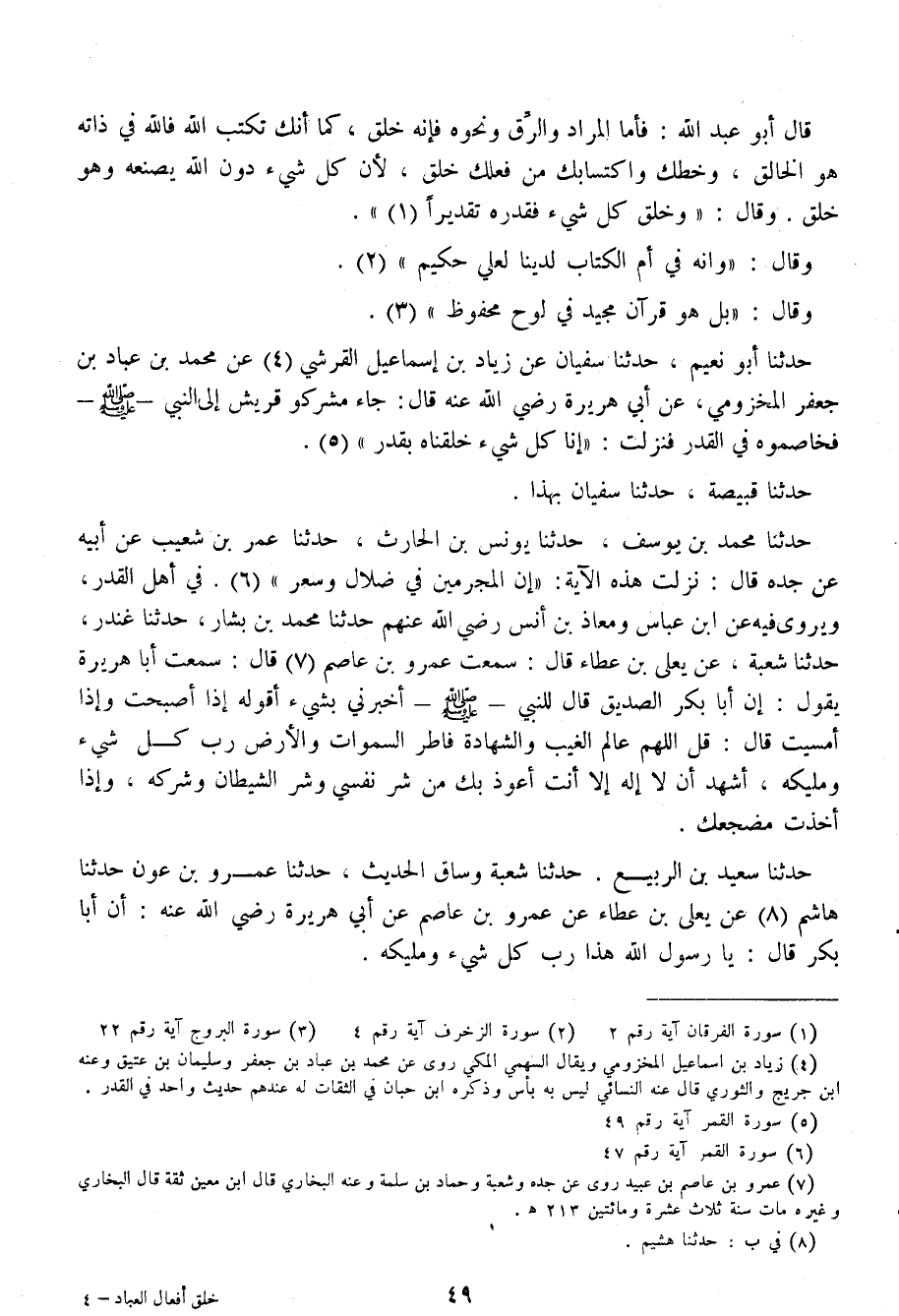 حَدَّثَنَا أَبُو نُعَيْمٍ، حَدَّثَنَا سُفْيَانُ، عَنْ زِيَادِ بْنِ إِسْمَاعِيلَ الْقُرَشِيِّ، عَنْ مُحَمَّدِ بْنِ عَبَّادِ بْنِ جَعْفَرٍ الْمَخْزُومِيِّ، عَنْ أَبِي هُرَيْرَةَ رَضِيَ اللَّهُ عَنْهُ قَالَ: «جَاءَ مُشْرِكُو قُرَيْشٍ إِلَى النَّبِيِّ صَلَّى اللهُ عَلَيْهِ وَسَلَّمَ فَخَاصَمُوهُ فِي الْقَدَرِ» فَنَزَلَتْ: {§إِنَّا كُلَّ شَيْءٍ خَلَقْنَاهُ بِقَدَرٍ} [القمر: 49] حَدَّثَنَا قَبِيصَةُ، حَدَّثَنَا سُفْيَانُ بِهَذَا