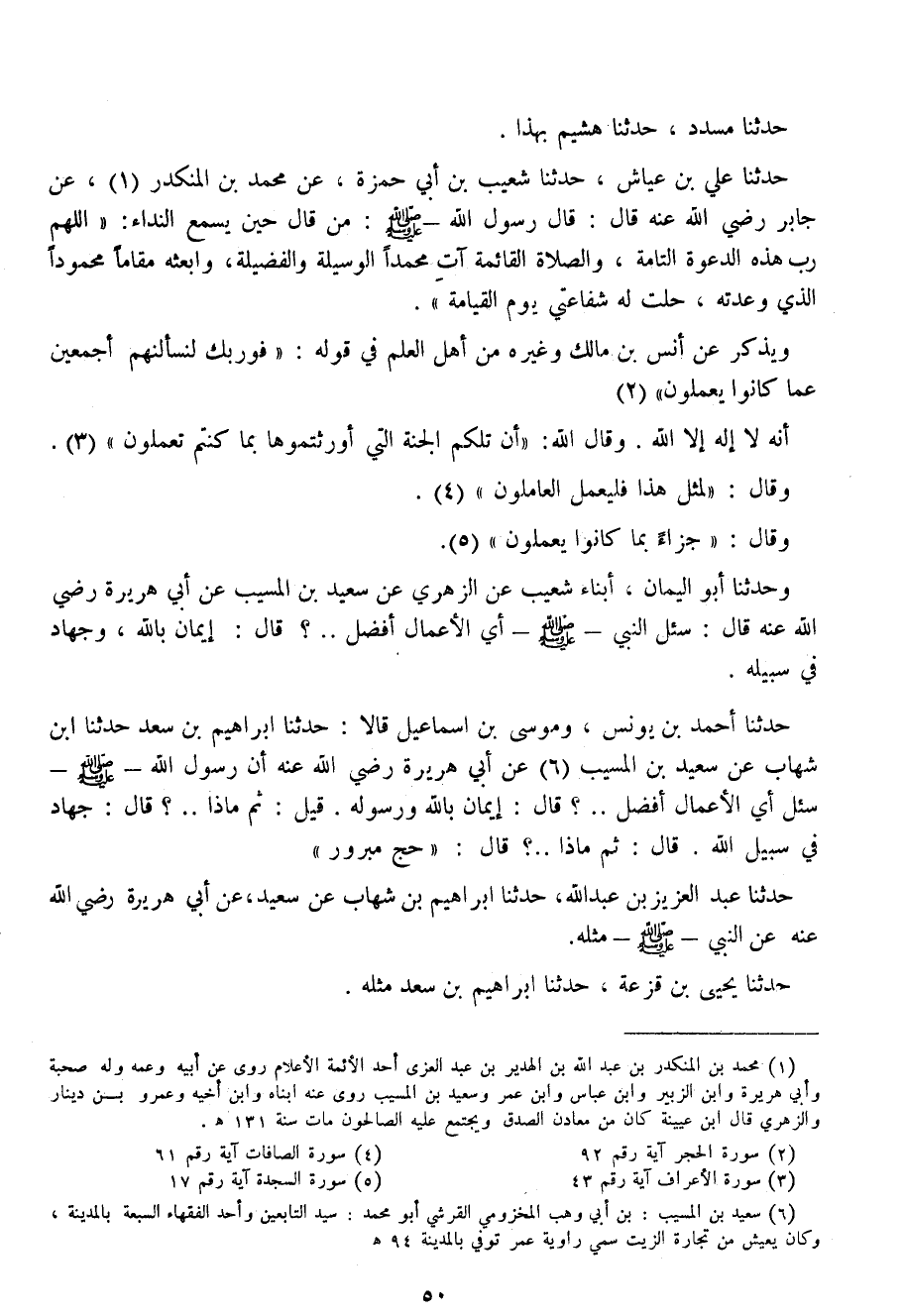 حَدَّثَنَا أَحْمَدُ بْنُ يُونُسَ، وَمُوسَى بْنُ إِسْمَاعِيلَ، قَالَا: حَدَّثَنَا إِبْرَاهِيمُ بْنُ سَعْدٍ، حَدَّثَنَا ابْنُ شِهَابٍ، عَنْ سَعِيدِ بْنِ الْمُسَيِّبِ، عَنْ أَبِي هُرَيْرَةَ رَضِيَ اللَّهُ عَنْهُ، إِنَّ رَسُولَ اللَّهِ صَلَّى اللهُ عَلَيْهِ وَسَلَّمَ سُئِلَ §أَيُّ الْأَعْمَالِ أَفْضَلُ؟ قَالَ: «إِيمَانٌ بِاللِّهِ وَرَسُولِهِ» ، قِيلَ: ثُمَّ مَاذَا؟ قَالَ: «جِهَادٌ فِي سَبِيلِ اللَّهِ» ، قَالَ: ثُمَّ مَاذَا؟ قَالَ: «حَجٌّ مَبْرُورٌ» حَدَّثَنَا عَبْدُ الْعَزِيزِ بْنُ عَبْدِ اللَّهِ، حَدَّثَنَا إِبْرَاهِيمُ، عَنِ ابْنُ شِهَابٍ، عَنْ سَعِيدٍ، عَنْ أَبِي هُرَيْرَةَ رَضِيَ اللَّهُ عَنْهُ، عَنِ النَّبِيِّ صَلَّى اللهُ عَلَيْهِ وَسَلَّمَ مِثْلَهُ. حَدَّثَنَا يَحْيَى بْنُ قَزَعَةَ، حَدَّثَنَا إِبْرَاهِيمُ بْنُ سَعْدٍ مِثْلَهُ -[51]-، حَدَّثَنَا عَبْدُ اللَّهِ بْنُ مُحَمَّدٍ، حَدَّثَنَا هِشَامٌ، أَنْبَأَ مَعْمَرٌ، عَنِ الزُّهْرِيِّ، عَنِ ابْنِ الْمُسَيِّبِ، عَنْ أَبِي هُرَيْرَةَ رَضِيَ اللَّهُ عَنْهُ قَالَ: " جَاءَ رَجُلٌ إِلَى النَّبِيِّ صَلَّى اللهُ عَلَيْهِ وَسَلَّمَ , فَقَالَ: يَا نَبِيَّ اللَّهِ أَيُّ الْأَعْمَالِ أَفْضَلُ؟ قَالَ: «إِيمَانٌ بِاللِّهِ» مِثْلَهُ