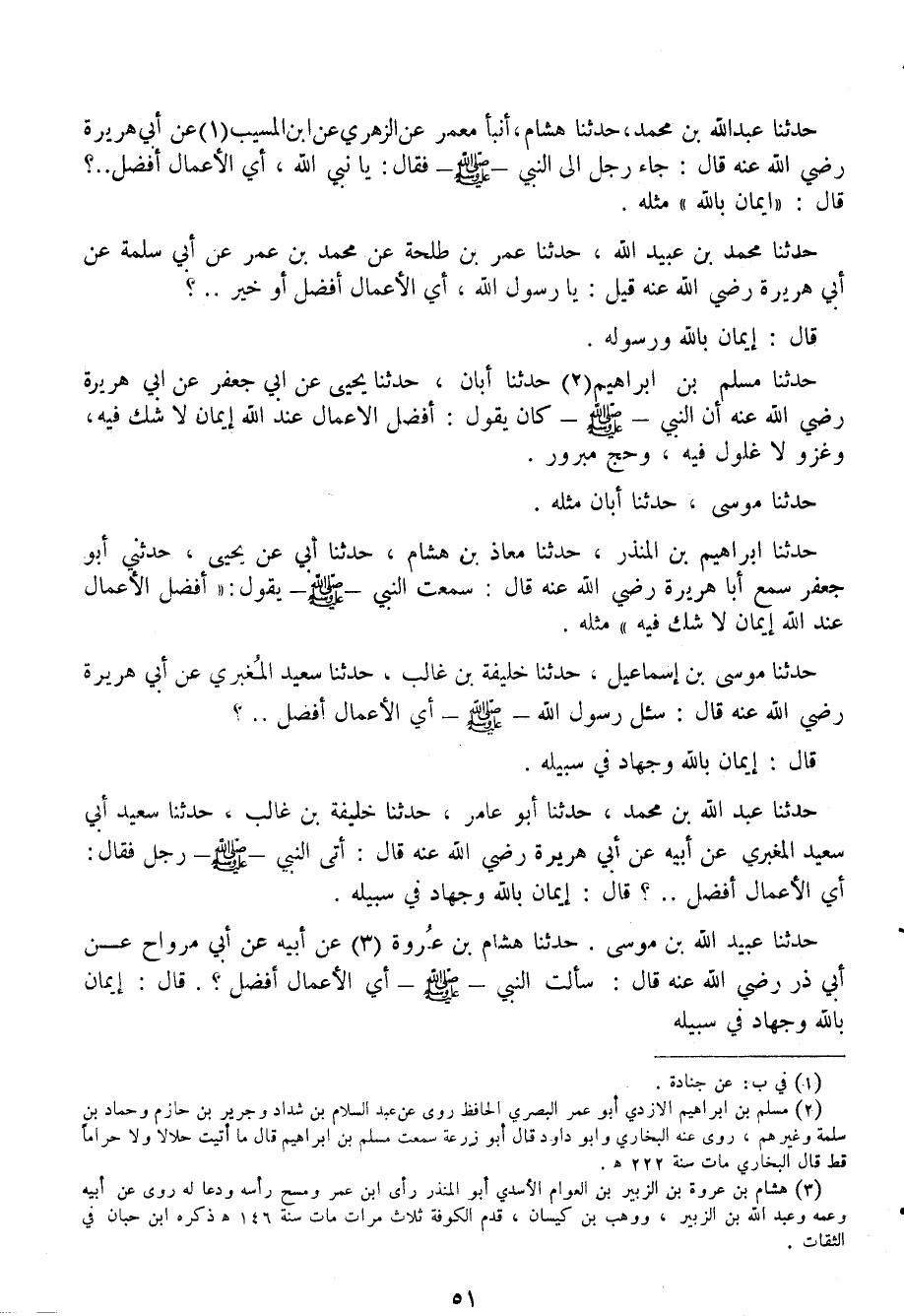 حَدَّثَنَا مُسْلِمُ بْنُ إِبْرَاهِيمَ، حَدَّثَنَا أَبَانُ، حَدَّثَنَا يَحْيَى، عَنْ أَبِي جَعْفَرٍ، عَنْ أَبِي هُرَيْرَةَ رَضِيَ اللَّهُ عَنْهُ، أَنَّ النَّبِيَّ صَلَّى اللهُ عَلَيْهِ وَسَلَّمَ كَانَ يَقُولُ: «§أَفْضَلُ الْأَعْمَالِ عِنْدَ اللَّهِ إِيمَانٌ لَا شَكَّ فِيهِ، وَغَزْوٌ لَا غُلُولَ فِيهِ، وَحَجٌّ مَبْرُورٌ» حَدَّثَنَا مُوسَى، حَدَّثَنَا أَبَانُ، مِثْلَهُ، حَدَّثَنَا إِبْرَاهِيمُ بْنُ الْمُنْذِرِ، حَدَّثَنَا مُعَاذُ بْنُ هِشَامٍ، حَدَّثَنَا أَبِي، عَنْ يَحْيَى، حَدَّثَنِي أَبُو جَعْفَرٍ، سَمِعَ أَبَا هُرَيْرَةَ رَضِيَ اللَّهُ عَنْهُ، قَالَ سَمِعْتُ النَّبِيَّ صَلَّى اللهُ عَلَيْهِ وَسَلَّمَ يَقُولُ: «أَفْضَلُ الْأَعْمَالِ عِنْدَ اللَّهِ إِيمَانٌ لَا شَكَّ فِيهِ» مِثْلَهُ